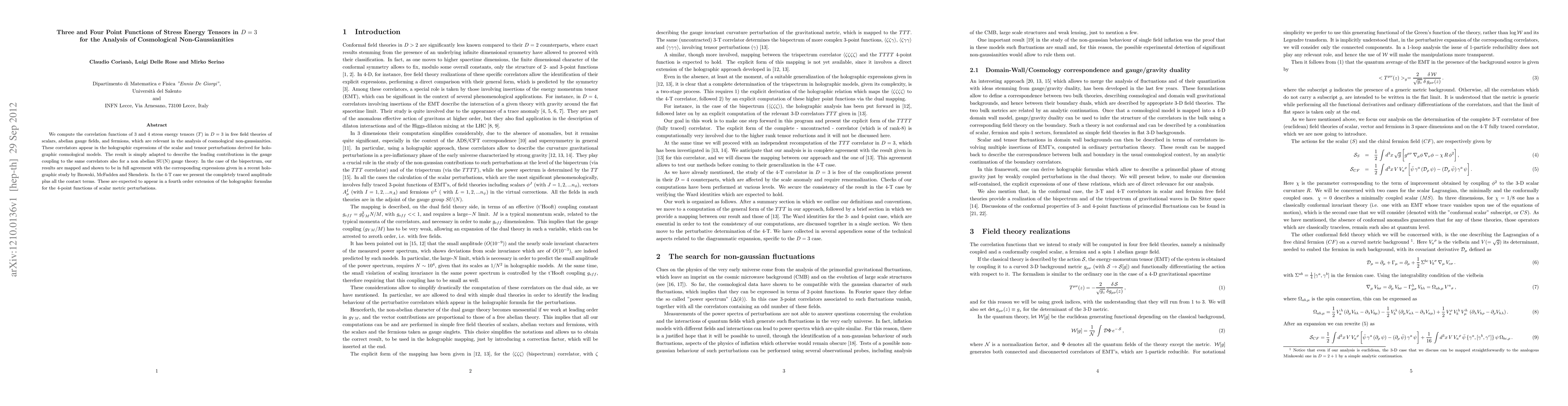 This paper computes the 3 and 4-point functions of stress-energy tensors in D=3 dimensions for scalars, abelian gauge fields, and fermions, relevant for analyzing cosmological non-Gaussianities. The results are adapted to describe contributions from non-abelian SU(N) gauge theories and align with recent holographic studies.