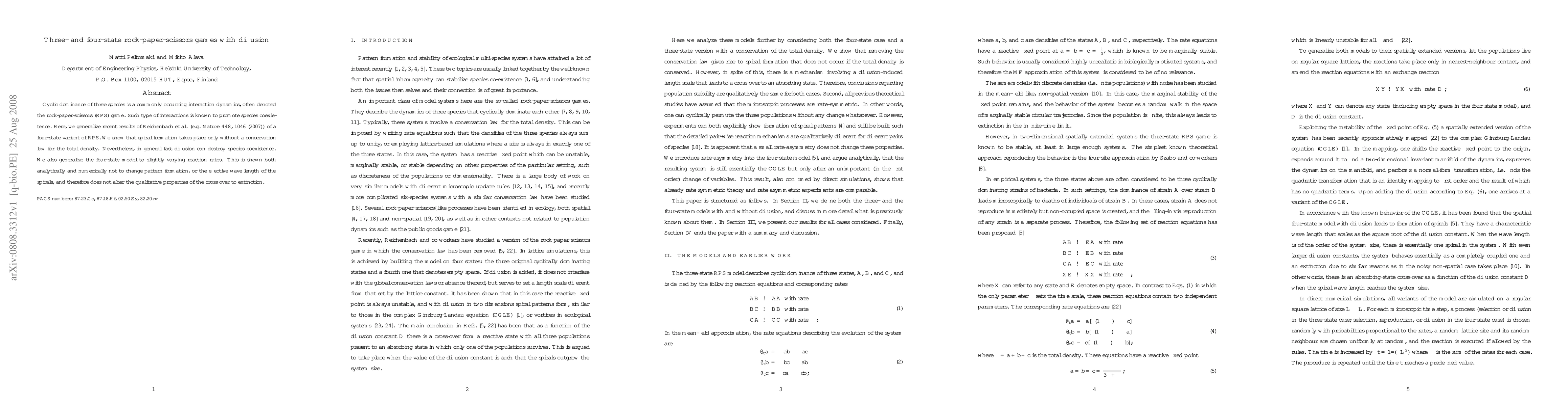 This paper generalizes the rock-paper-scissors (RPS) game dynamics to three- and four-state models with diffusion, showing that spiral formations occur without a conservation law for total density but fast diffusion can disrupt species coexistence. The study also demonstrates that slight variations in reaction rates do not affect pattern formation or spiral wavelengths.