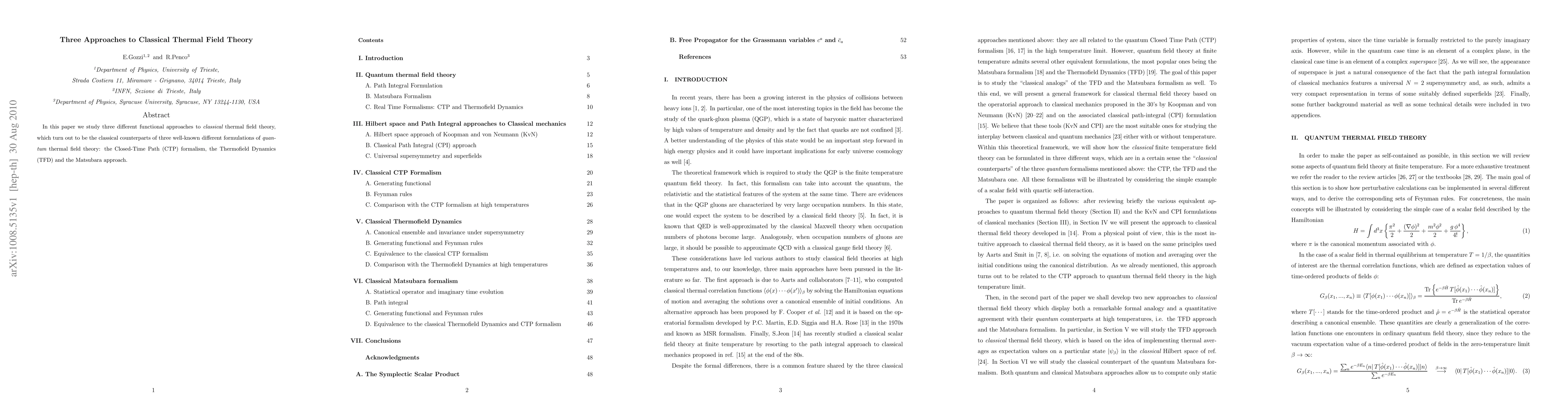 In this paper we study three different functional approaches to classical thermal field theory, which turn out to be the classical counterparts of three well-known different formulations of quantum thermal field theory: the Closed-Time Path (CTP) formalism, the Thermofield Dynamics (TFD) and the Matsubara approach.