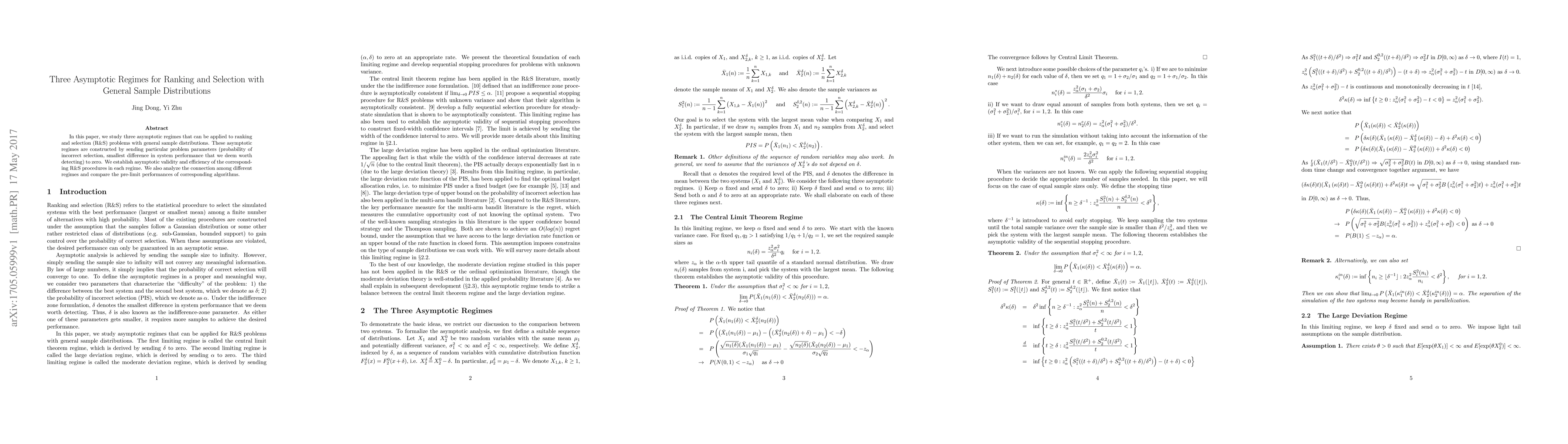 This paper explores three asymptotic regimes for ranking and selection problems under general sample distributions, analyzing the efficiency and validity of associated procedures as key parameters approach zero. It also examines the relationships between these regimes and compares the performance of corresponding algorithms before reaching the asymptotic limit.