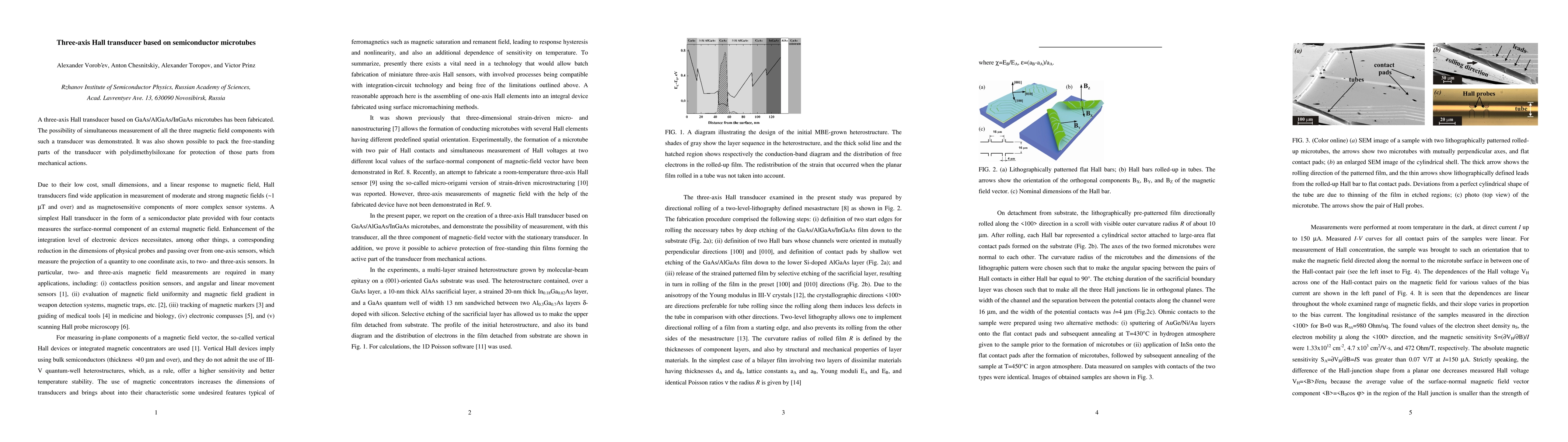 This paper presents a three-axis Hall transducer made from GaAs/AlGaAs/InGaAs microtubes, demonstrating its capability to simultaneously measure all three magnetic field components. Additionally, the study explores the protection of the transducer's free-standing parts using polydimethylsiloxane.
