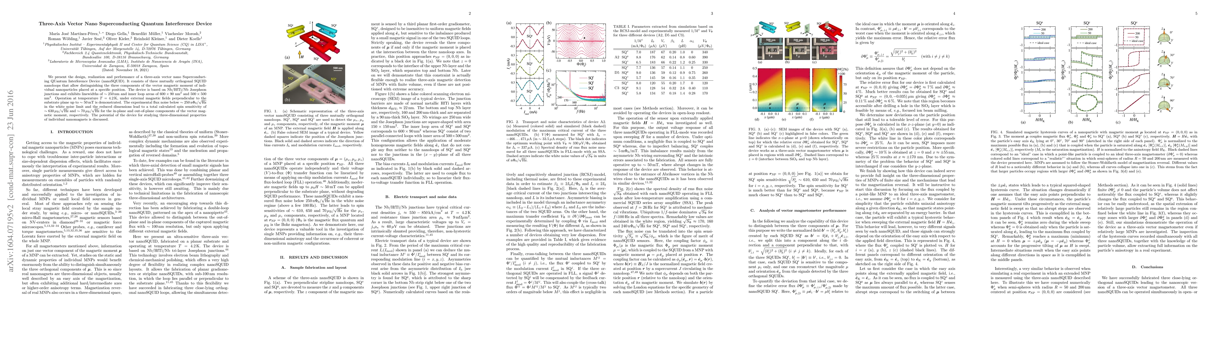 This paper details the design and performance of a three-axis vector nanoSQUID, capable of detecting the three components of the magnetic moment of nanoparticles. The device, operating at 4.2 K, exhibits high sensitivity and potential for studying the tridimensional magnetic properties of nanomagnets.