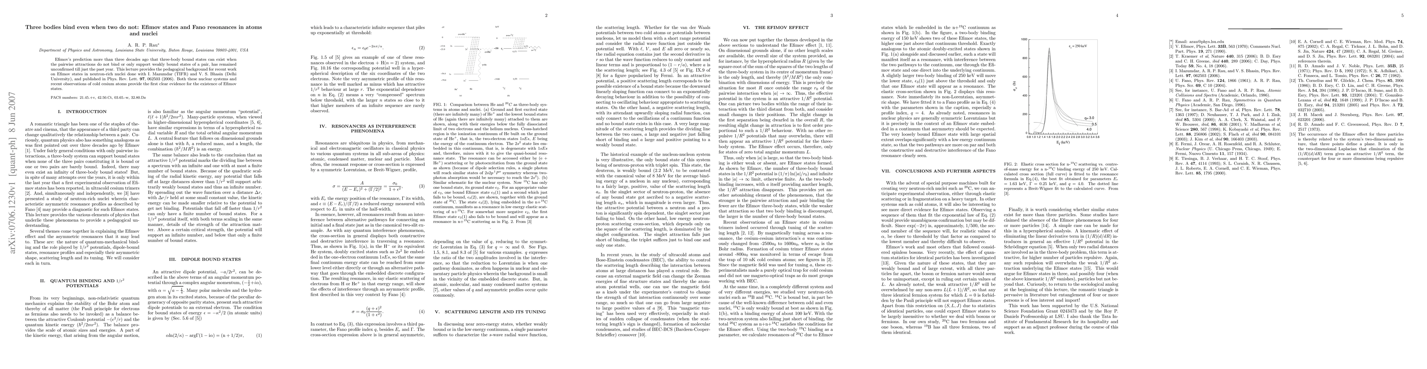 This paper discusses the confirmation of Efimov's prediction of three-body bound states in systems where pairwise attractions do not bind, providing evidence through neutron-rich nuclei and cold cesium atoms. The findings were published in Phys. Rev. Lett. 97, 062503 (2006).