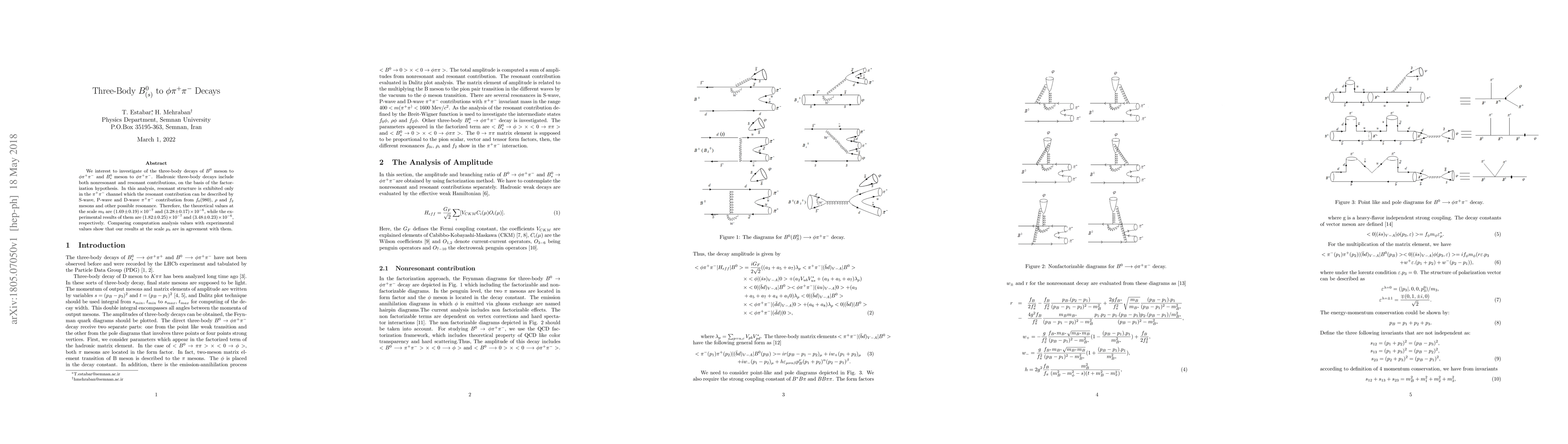 This paper investigates the three-body decays of $B^0$ and $B_s^0$ mesons into $\phi\pi^+\pi^-$, analyzing both resonant and nonresonant contributions. The resonant structure in the $\pi^+\pi^-$ channel is described by S-wave, P-wave, and D-wave contributions from $f_0(980)$, $\rho$, and $f_2$ mesons. Theoretical and experimental decay rates are compared, showing good agreement.