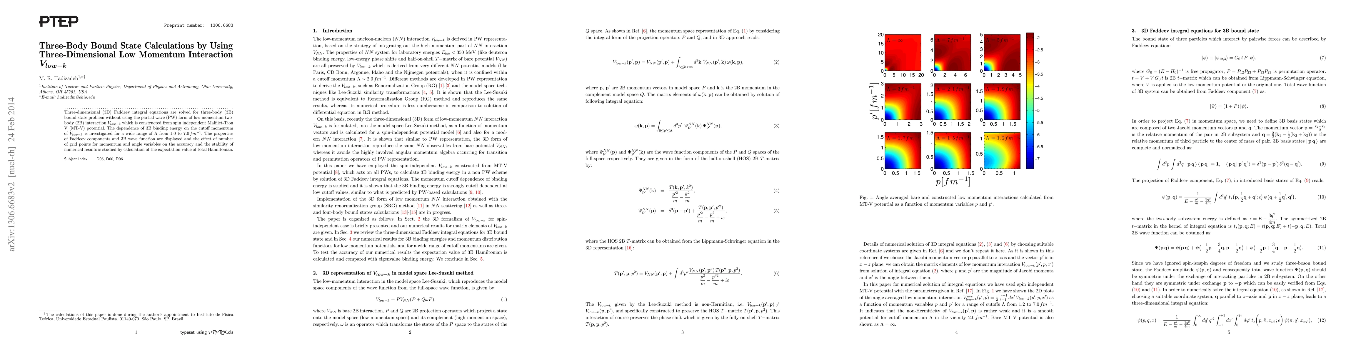 This paper solves three-body bound state problems using three-dimensional Faddeev equations and a low momentum interaction $V_{low-k}$, avoiding partial wave decomposition. It examines the binding energy's dependence on the cutoff momentum and investigates the impact of numerical grid resolution on results accuracy.