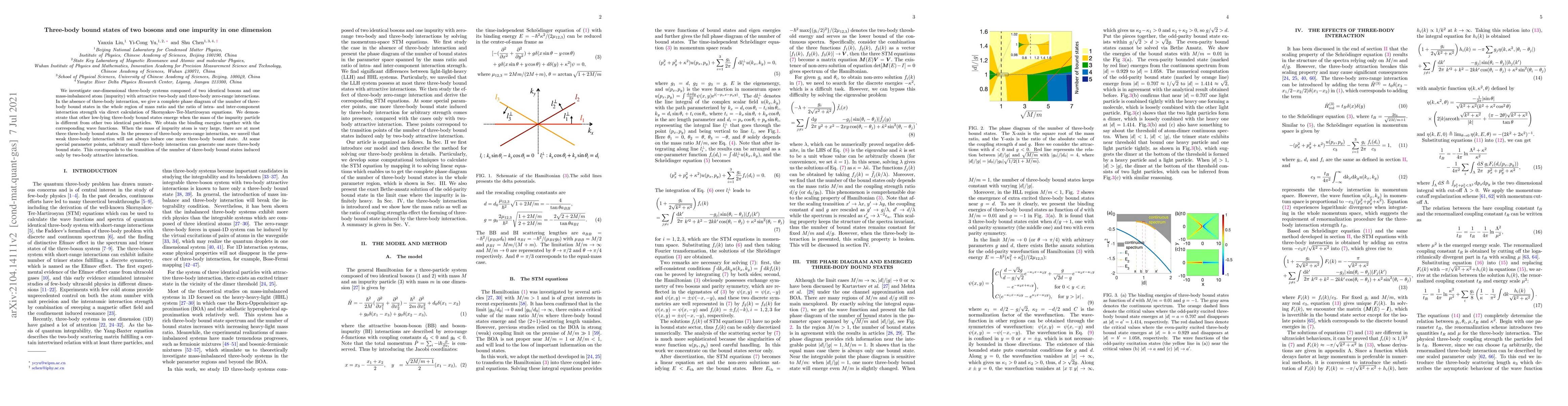 This paper explores one-dimensional three-body systems of two bosons and one impurity atom, detailing phase diagrams and the emergence of bound states under varying mass ratios and interactions. It reveals that three-body zero-range interactions can induce additional bound states, particularly when the impurity mass is significantly different.