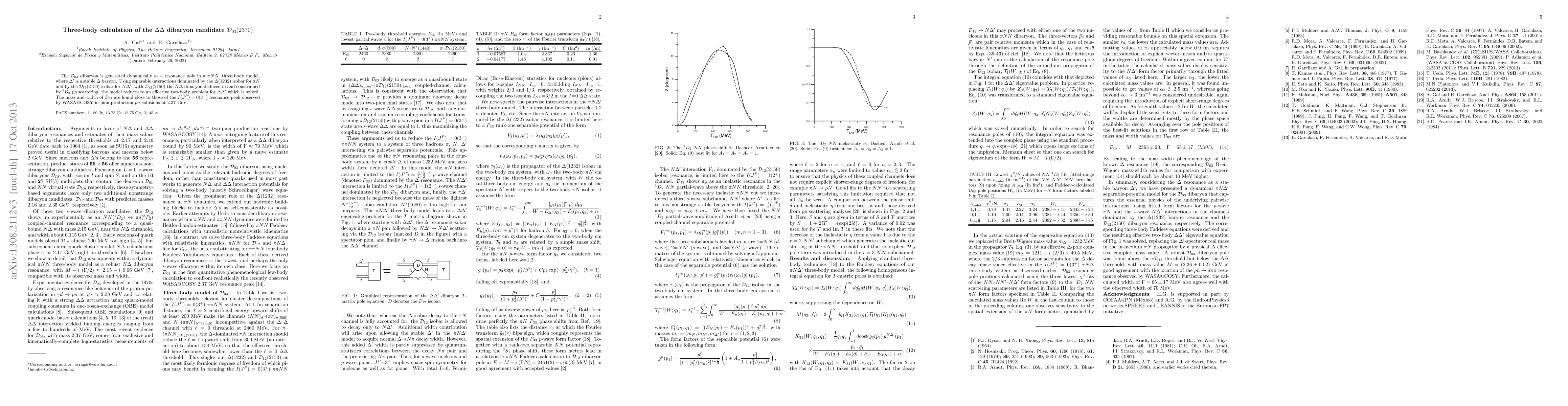 Researchers calculate the mass and width of a dibaryon candidate D(03) at 2.37 GeV using a three-body model, finding results consistent with experimental observations.