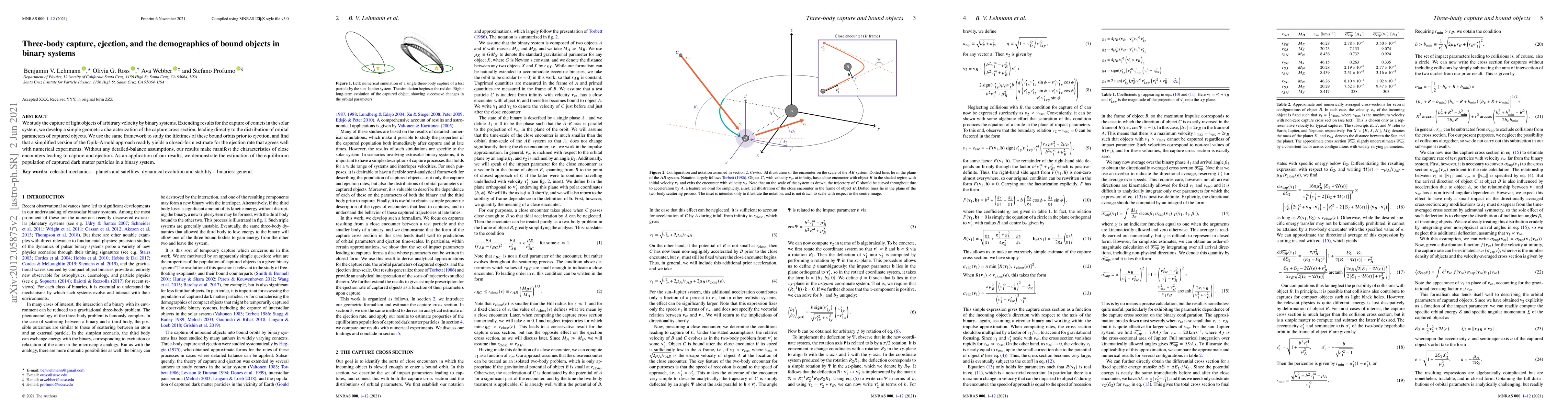 This research presents a geometric characterization of the capture cross section for light objects by binary systems, leading to the distribution of orbital parameters of captured objects. It also provides a closed-form estimate for the ejection rate of these bound orbits, applicable to dark matter particles in binary systems.