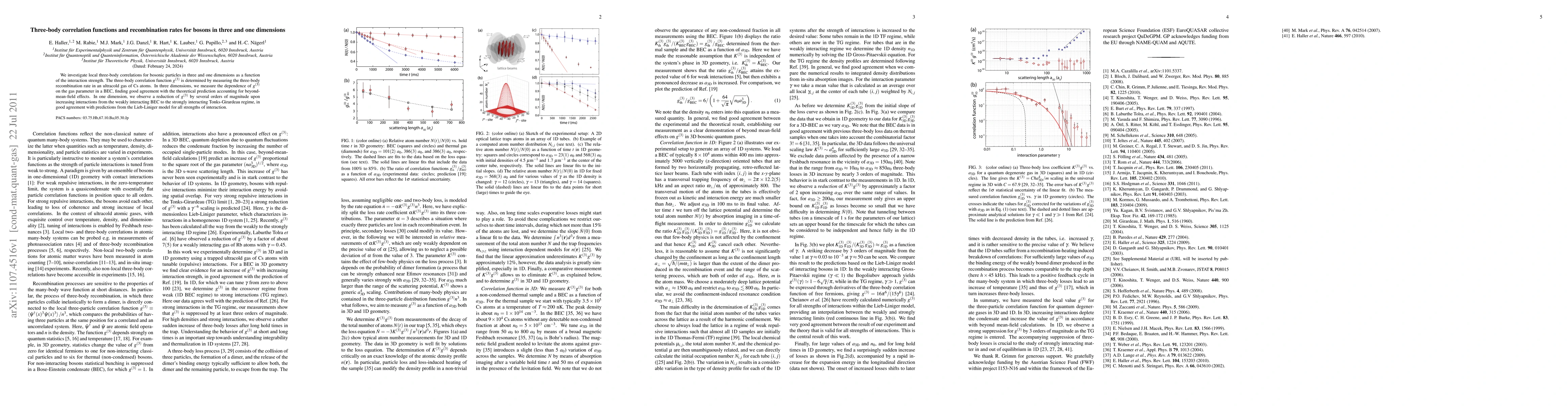 This paper investigates three-body correlation functions and recombination rates for bosons in three and one dimensions, finding good agreement between experimental measurements and theoretical predictions, especially in the transition from weakly interacting to strongly interacting regimes.