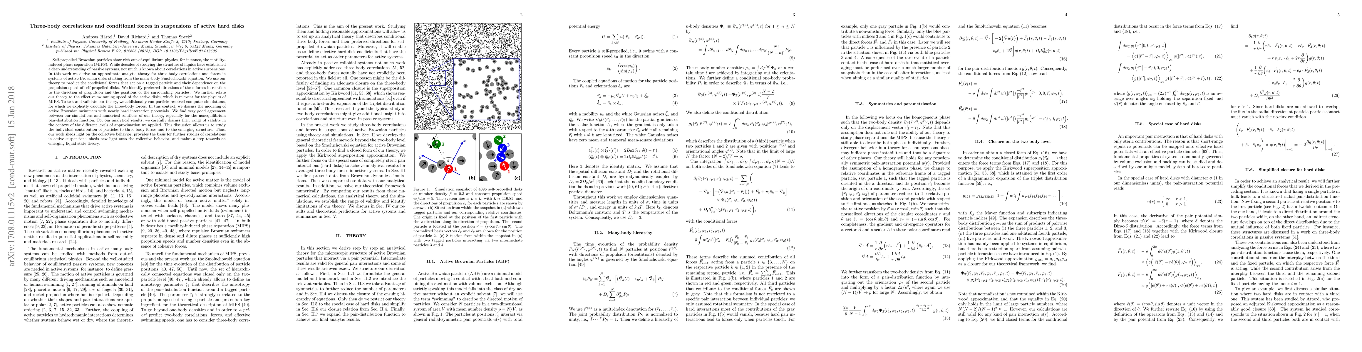 The research derives an approximate analytic theory for three-body correlations and forces in systems of active hard disks from the many-body Smoluchowski equation, validating it through particle-resolved computer simulations.