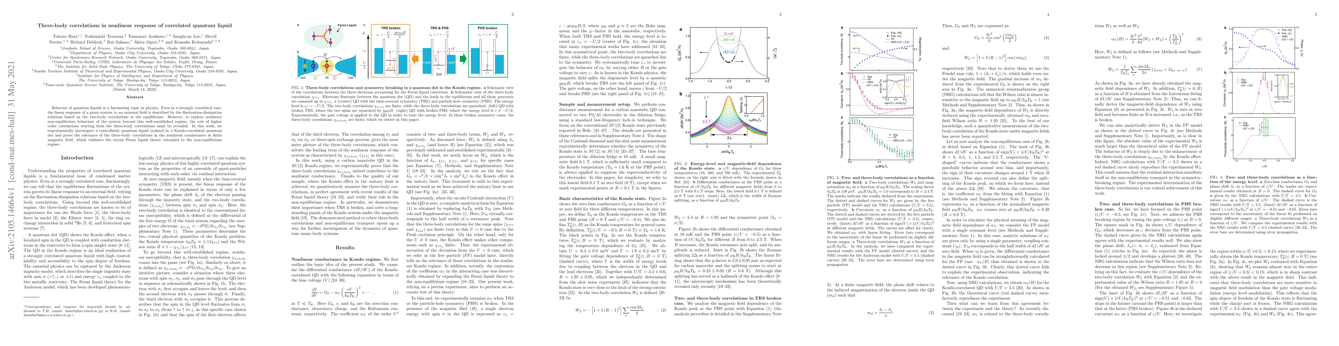 Behavior of quantum liquids is a fascinating topic in physics. Even in a strongly correlated case, the linear response of a given system to an external field is described by the fluctuation-dissipation relations based on the two-body correlations in the equilibrium. However, to explore nonlinear non-equilibrium behaviors of the system beyond this well-established regime, the role of higher order correlations starting from the three-body correlations must be revealed. In this work, we experimentally investigate a controllable quantum liquid realized in a Kondo-correlated quantum dot and prove the relevance of the three-body correlations in the nonlinear conductance at finite magnetic field, which validates the recent Fermi liquid theory extended to the non-equilibrium regime.