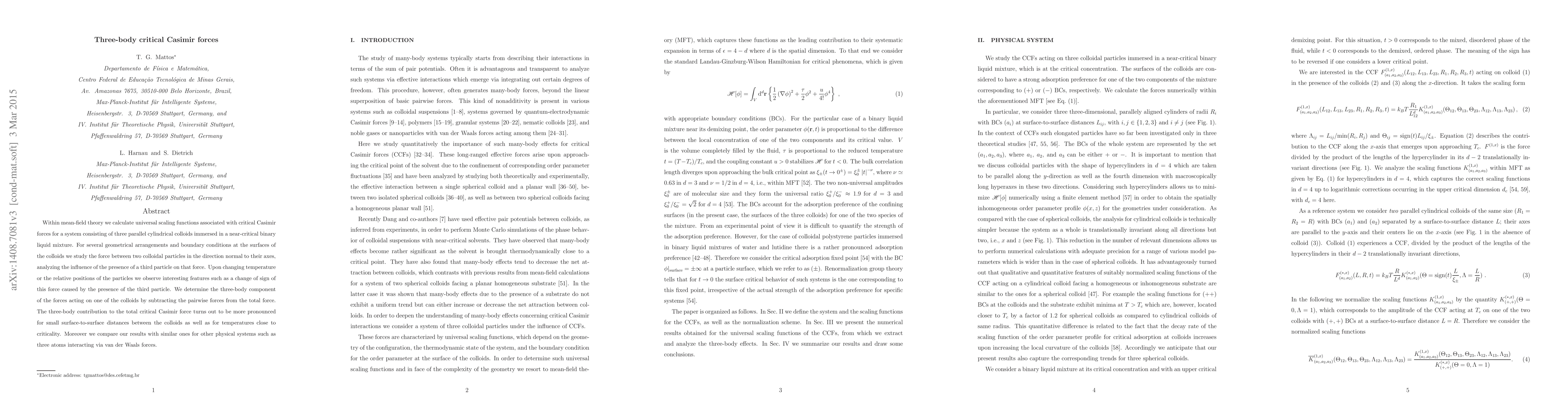 This paper investigates critical Casimir forces between three parallel cylindrical colloids in a near-critical binary liquid mixture, determining the three-body component's influence on the force between two particles. The study reveals significant three-body effects, especially at small inter-colloid distances and near critical temperatures, and compares these findings to analogous systems like van der Waals interactions among three atoms.