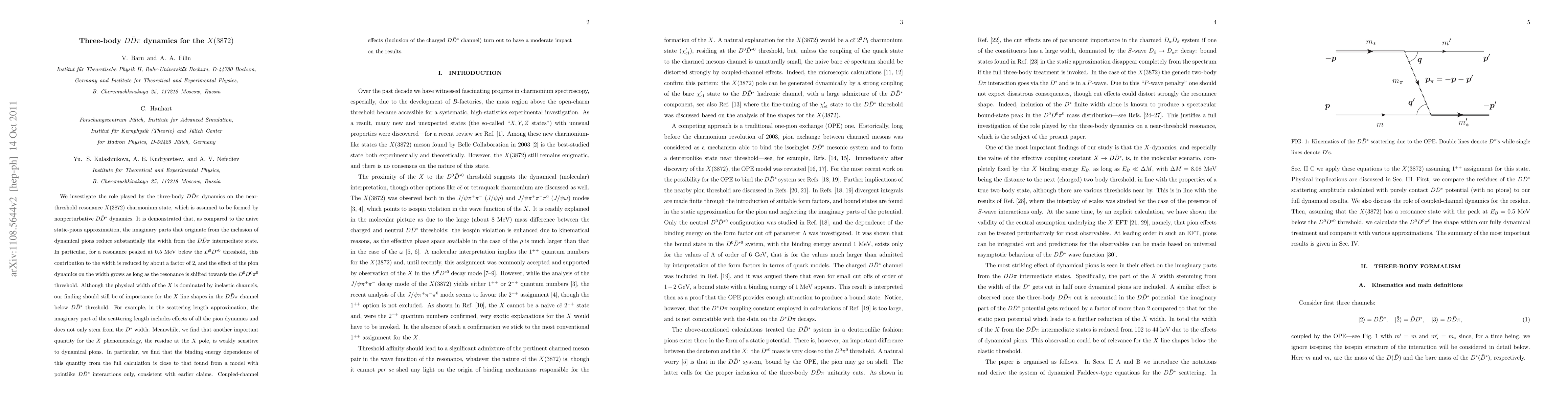 We investigate the role played by the three-body $D\bar{D}\pi$ dynamics on the near-threshold resonance X(3872) charmonium state, which is assumed to be formed by nonperturbative $D\bar D^*$ dynamics. It is demonstrated that, as compared to the naive static-pions approximation, the imaginary parts that originate from the inclusion of dynamical pions reduce substantially the width from the $D\bar{D}\pi$ intermediate state. In particular, for a resonance peaked at 0.5 MeV below the $D^0\bar D^{*0}$ threshold, this contribution to the width is reduced by about a factor of 2, and the effect of the pion dynamics on the width grows as long as the resonance is shifted towards the $D^0\bar{D^0}\pi^0$ threshold. Although the physical width of the $X$ is dominated by inelastic channels, our finding should still be of importance for the $X$ line shapes in the $D\bar{D}\pi$ channel below $D{\bar D}^*$ threshold. For example, in the scattering length approximation, the imaginary part of the scattering length includes effects of all the pion dynamics and does not only stem from the $D^*$ width. Meanwhile, we find that another important quantity for the $X$ phenomenology, the residue at the $X$ pole, is weakly sensitive to dynamical pions. In particular, we find that the binding energy dependence of this quantity from the full calculation is close to that found from a model with pointlike $D\bar D^*$ interactions only, consistent with earlier claims. Coupled-channel effects (inclusion of the charged $D\bar{D}^*$ channel) turn out to have a moderate impact on the results.