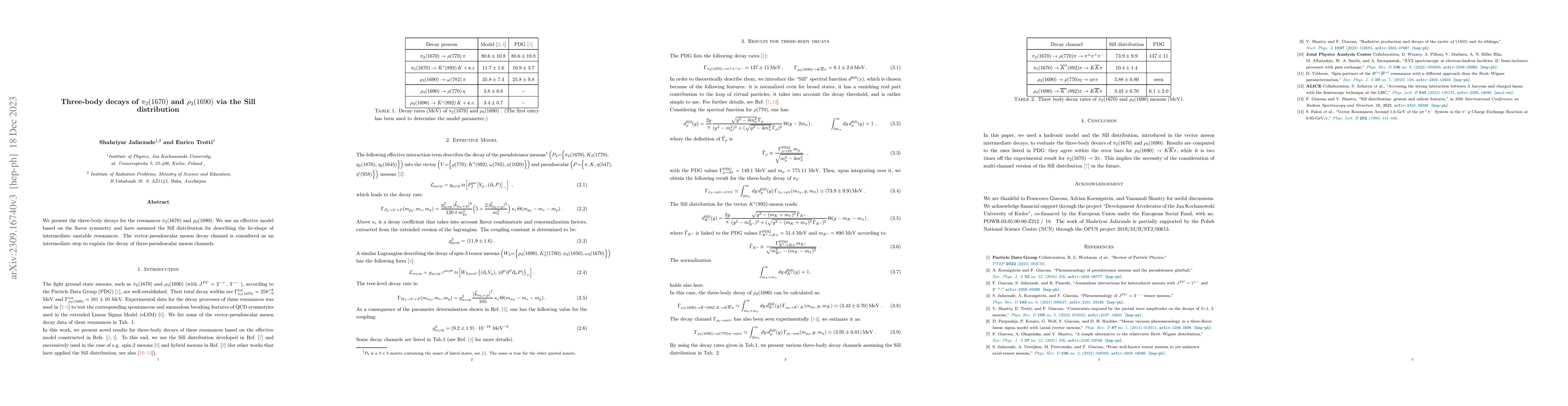We present the three-body decays for the resonances $\pi_{2}(1670)$ and $ \rho_3(1690)$. We use an effective model based on the flavor symmetry and have assumed the Sill distribution for describing the lie-shape of intermediate unstable resonances. The vector-pseudoscalar meson decay channel is considered as an intermediate step to explain the decay of three-pseudoscalar meson channels.