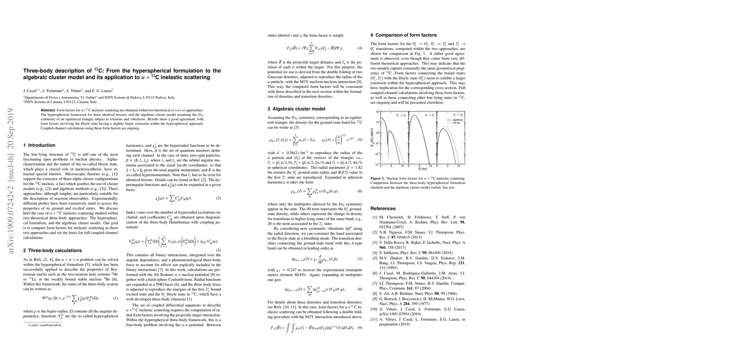 Form factors for $\alpha+{^{12}}$C inelastic scattering are obtained within two theoretical ($\alpha+\alpha+\alpha$) approaches: The hyperspherical framework for three identical bosons, and the algebraic cluster model assuming the $D_{3h}$ symmetry of an equilateral triangle subject to rotations and vibrations. Results show a good agreement, with form factors involving the Hoyle state having a slightly larger extension within the hyperspherical approach. Coupled-channel calculations using these form factors are ongoing.