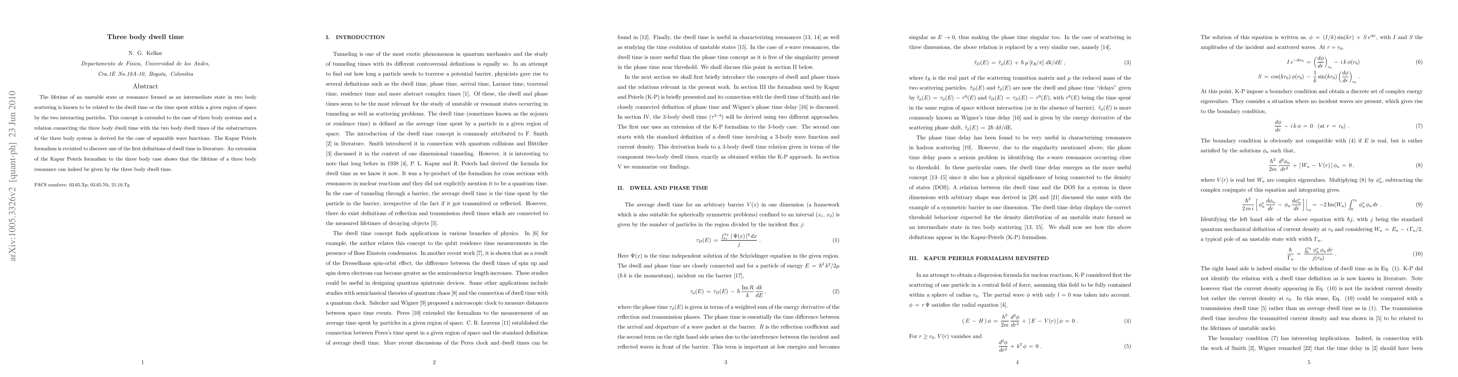 The lifetime of an unstable state or resonance formed as an intermediate state in two body scattering is known to be related to the dwell time or the time spent within a given region of space by the two interacting particles. This concept is extended to the case of three body systems and a relation connecting the three body dwell time with the two body dwell times of the substructures of the three body system is derived for the case of separable wave functions. The Kapur Peierls formalism is revisited to discover one of the first definitions of dwell time in literature. An extension of the Kapur Peierls formalism to the three body case shows that the lifetime of a three body resonance can indeed be given by the three body dwell time.