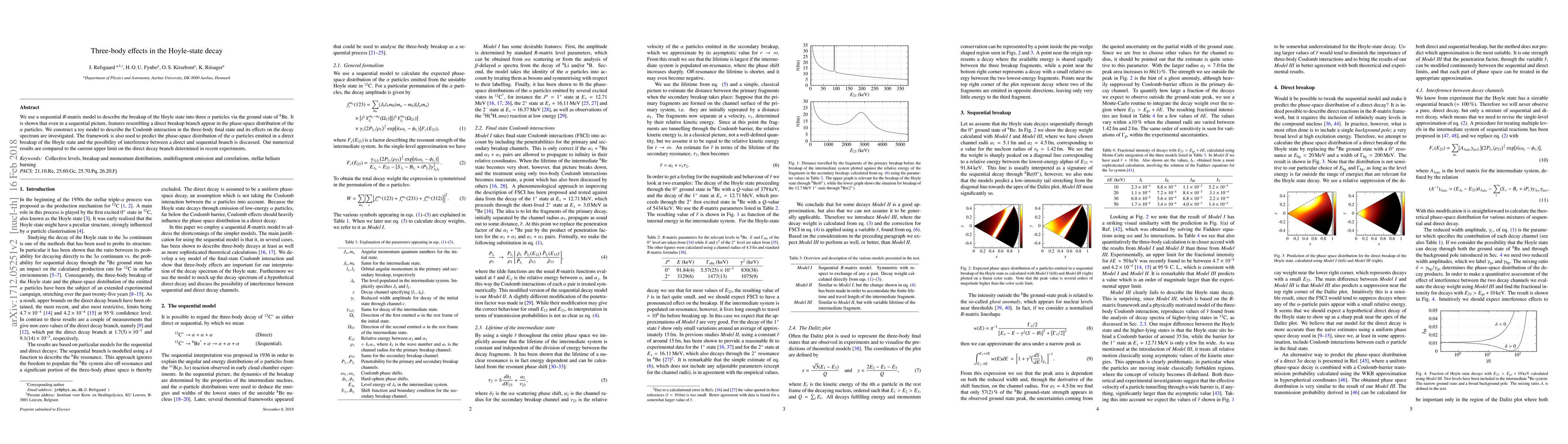Researchers used a model to study the breakup of the Hoyle state into three alpha particles, finding features that resemble direct decay branches in the final state's phase-space distribution. Their results compare favorably with current experimental limits on the direct decay branch.