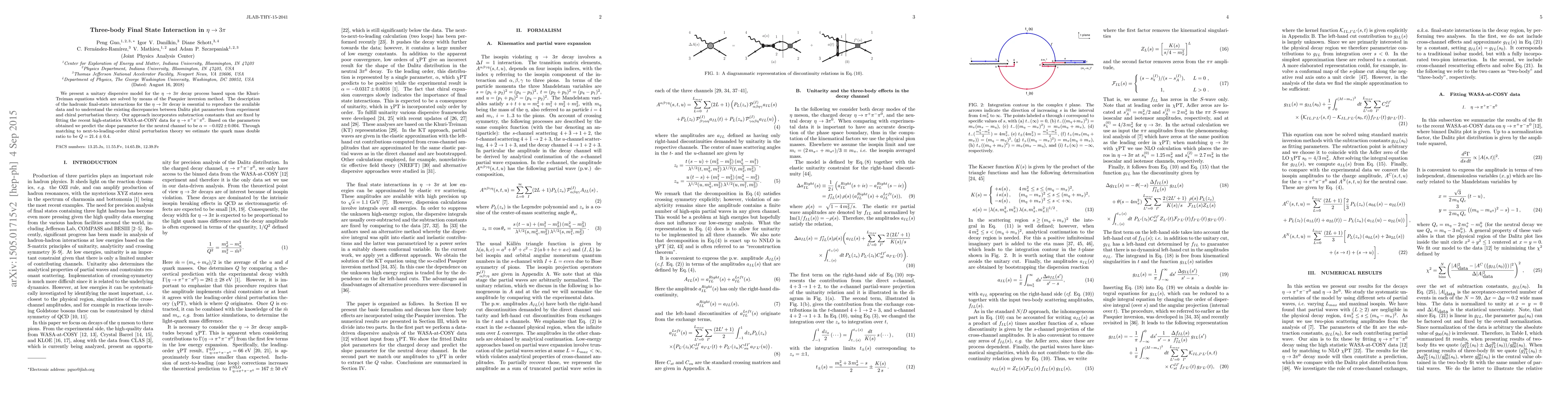 This paper develops a unitary dispersive model for the $\eta \to 3 \pi$ decay using Khuri-Treiman equations and Pasquier inversion, aiming to explain discrepancies in Dalitz plot parameters. The model predicts a slope parameter $\alpha=-0.022\pm 0.004$ for the neutral channel and estimates a quark mass double ratio $Q=21.4 \pm 0.4$.