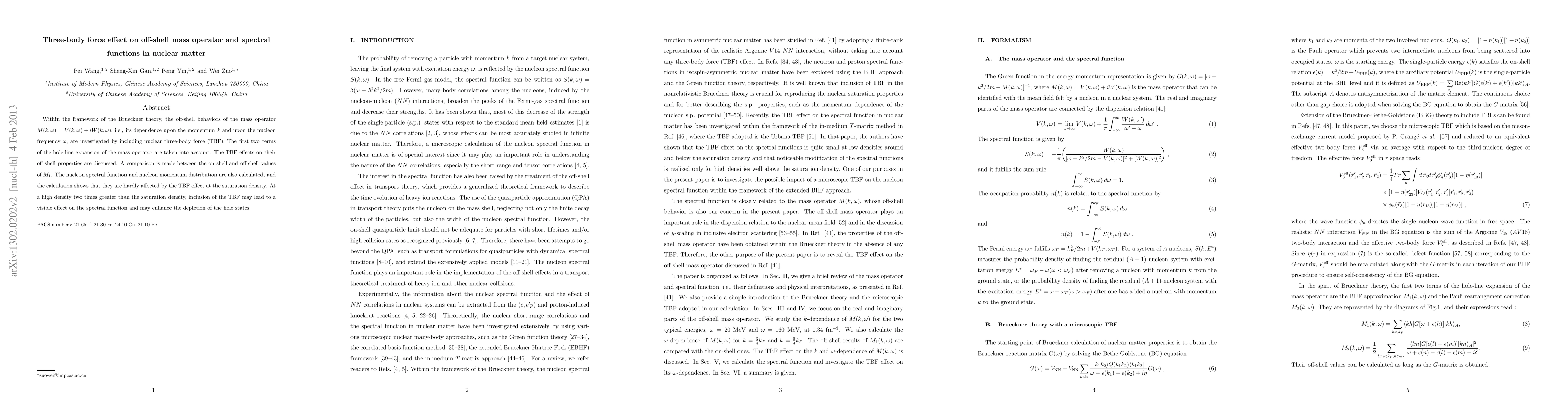 This research investigates the impact of nuclear three-body force (TBF) on the off-shell mass operator and spectral functions in nuclear matter within the Brueckner theory. It finds that while TBF effects are minimal at saturation density, they may significantly influence the spectral function and hole state depletion at densities twice the saturation density.