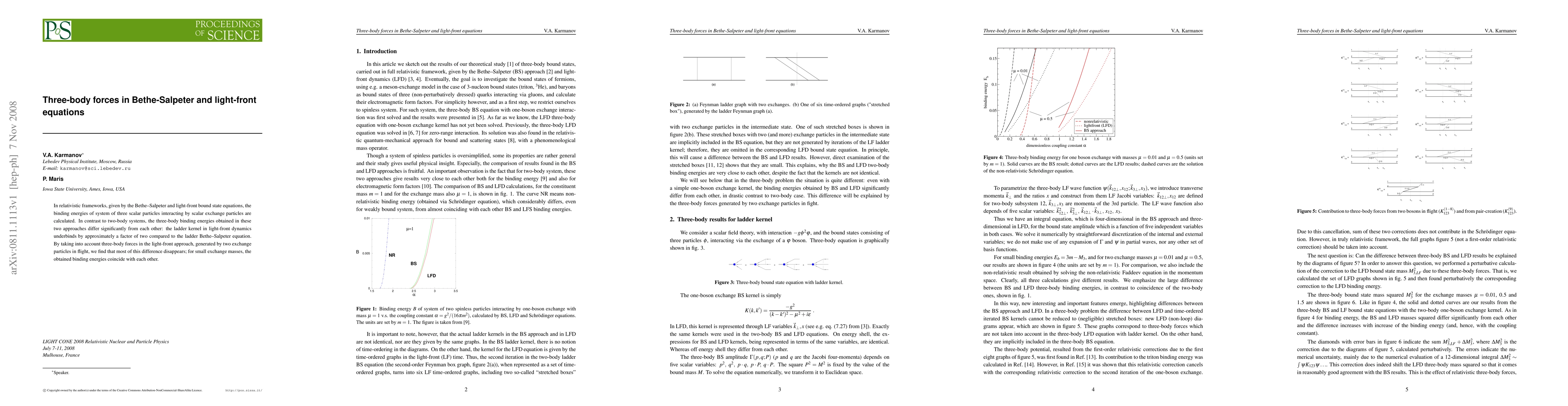 This paper investigates the binding energies of three-scalar particle systems using the Bethe-Salpeter and light-front equations, finding significant discrepancies between the two approaches. Incorporating three-body forces in the light-front dynamics, especially with small exchange masses, largely reconciles these differences.