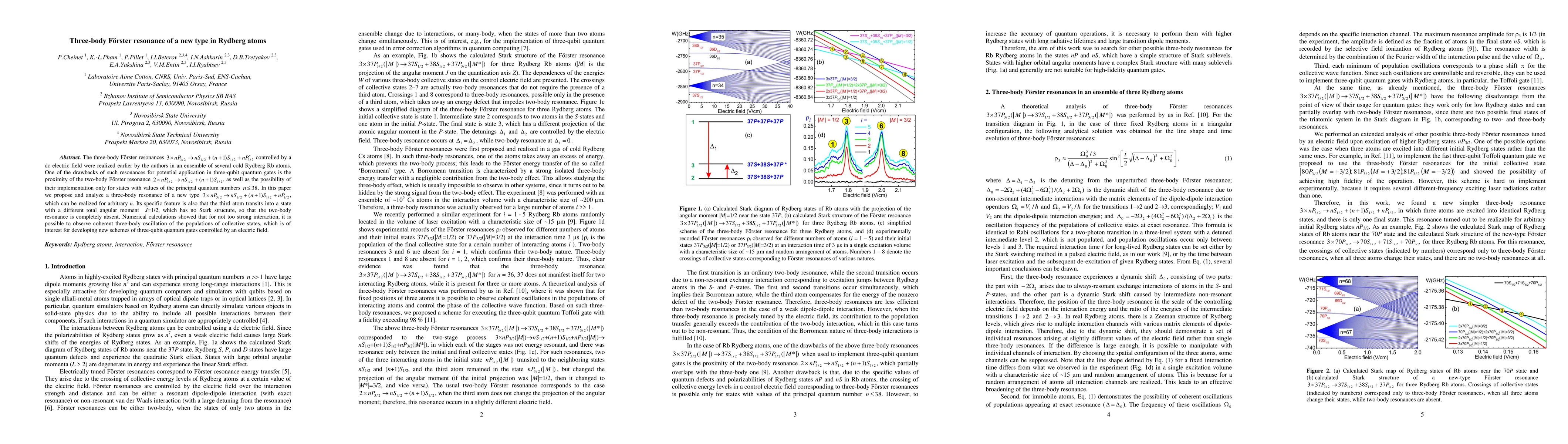 The three-body F\"orster resonances ${\rm 3}\times nP_{3/2} \to nS_{1/2} +(n+1)S_{1/2} +nP_{3/2}^{*} $ controlled by a dc electric field were realized earlier by the authors in an ensemble of several cold Rydberg Rb atoms. One of the drawbacks of such resonances for potential application in three-qubit quantum gates is the proximity of the two-body F\"orster resonance ${\rm 2}\times nP_{3/2} \to nS_{1/2} +(n+1)S_{1/2}, $ as well as the possibility of their implementation only for states with values of the principal quantum numbers $n\le 38$. In this paper we propose and analyze a three-body resonance of a new type ${\rm 3}\times nP_{3/2} \to nS_{1/2} +(n+1)S_{1/2} +nP_{1/2} , $ which can be realized for arbitrary $n$. Its specific feature is also that the third atom transits into a state with a different total angular moment $J=1/2$, which has no Stark structure, so that the two-body resonance is completely absent. Numerical calculations showed that for not too strong interaction, it is possible to observe coherent three-body oscillation of the populations of collective states, which is of interest for developing new schemes of three-qubit quantum gates controlled by an electric field.