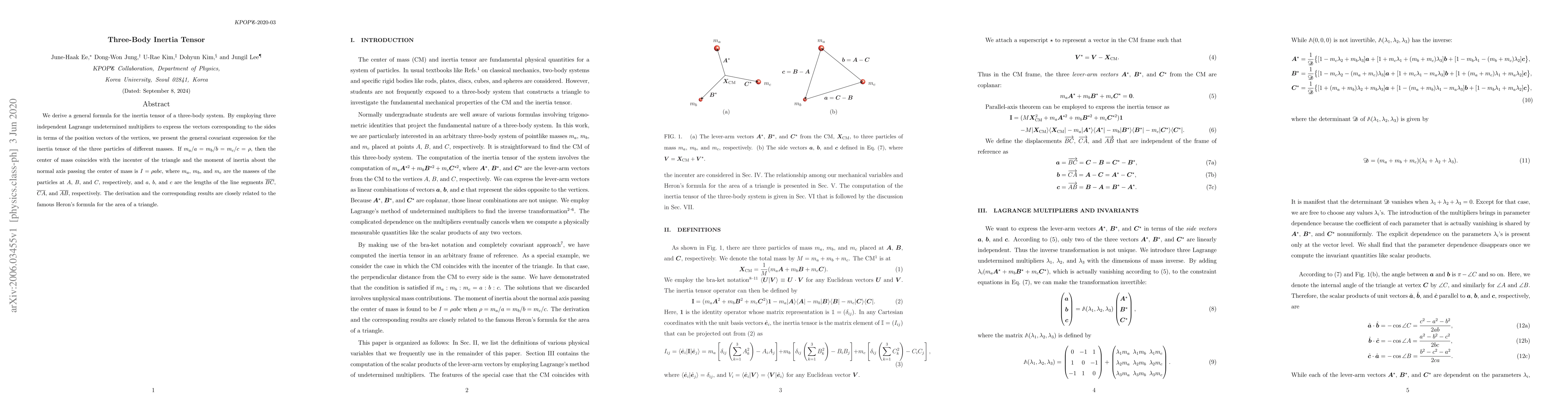 Researchers derived a general formula for the inertia tensor of a three-body system using Lagrange undetermined multipliers, providing an expression that relates masses and lengths to calculate moment of inertia.