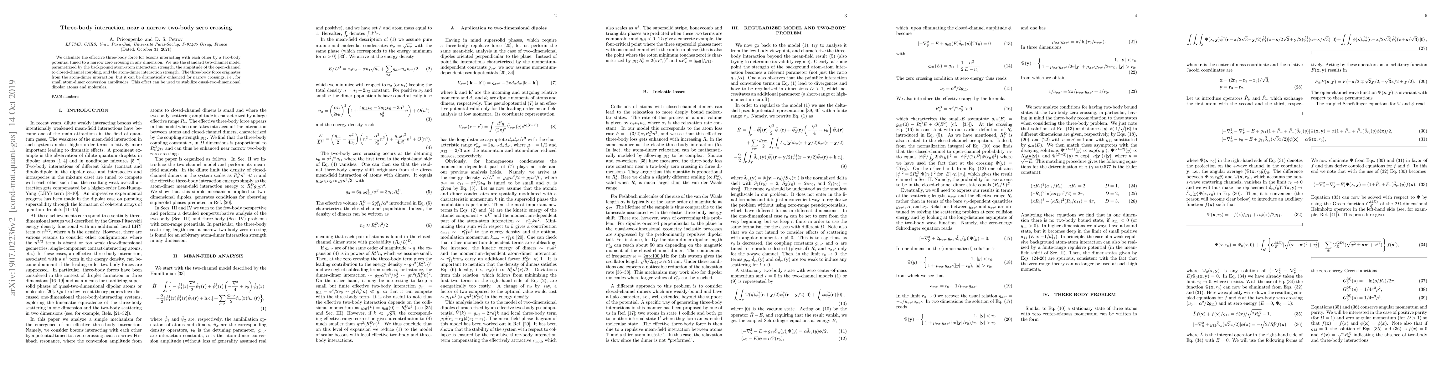 We calculate the effective three-body force for bosons interacting with each other by a two-body potential tuned to a narrow zero crossing in any dimension. We use the standard two-channel model parametrized by the background atom-atom interaction strength, the amplitude of the open-channel to closed-channel coupling, and the atom-dimer interaction strength. The three-body force originates from the atom-dimer interaction, but it can be dramatically enhanced for narrow crossings, i.e., for small atom-dimer conversion amplitudes. This effect can be used to stabilize quasi-two-dimensional dipolar atoms and molecules.