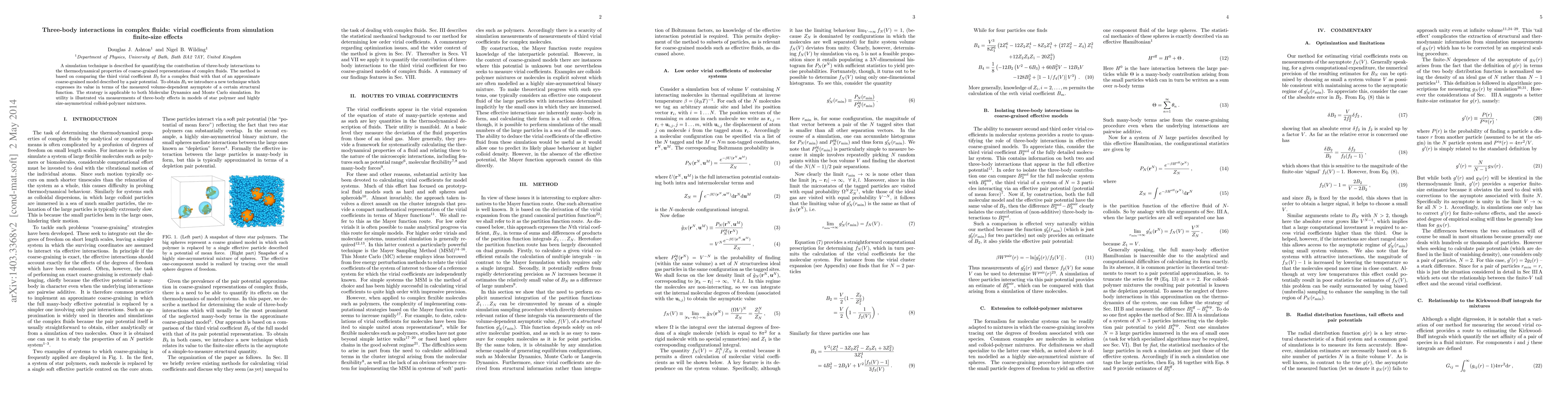 A simulation technique is described for quantifying the contribution of three-body interactions to the thermodynamical properties of coarse-grained representations of complex fluids. The method is based on comparing the third virial coefficient $B_3$ for a complex fluid with that of an approximate coarse-grained model described by a pair potential. To obtain $B_3$ we introduce a new technique which expresses its value in terms of the measured volume-dependent asymptote of a certain structural function. The strategy is applicable to both Molecular Dynamics and Monte Carlo simulation. Its utility is illustrated via measurements of three-body effects in models of star polymer and highly size-asymmetrical colloid-polymer mixtures.