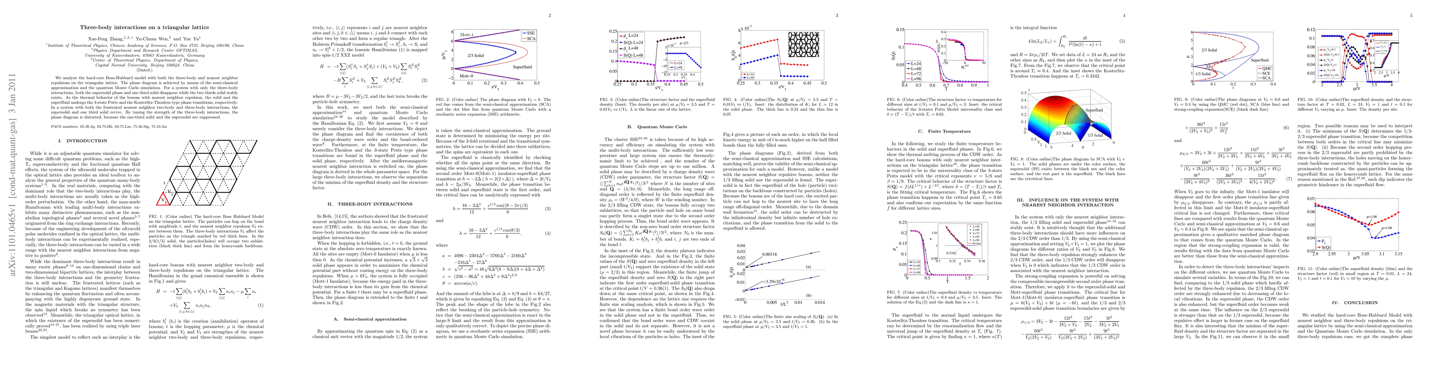 This paper investigates the hard-core Bose-Hubbard model on a triangular lattice with both three-body and nearest neighbor repulsions, revealing that the supersolid phase and one third solid vanish in the presence of three-body interactions alone, while the two thirds solid persists. The study also finds that the system undergoes distinct phase transitions influenced by thermal behavior and interaction strengths.