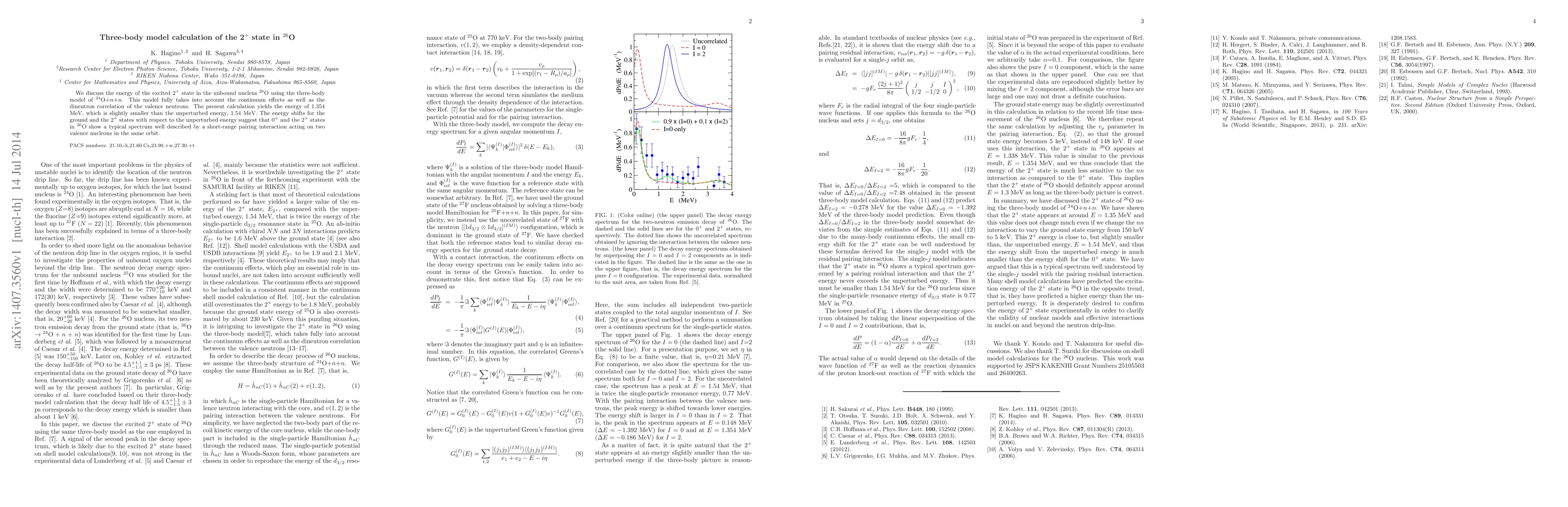 The research applies a three-body model to calculate the energy of the excited 2+ state in the unbound nucleus 26O, using the 24O+n+n system. The model considers continuum effects and dineutron correlation of valence neutrons, yielding an energy of 1.354 MeV, slightly less than the unperturbed energy. The findings suggest that the ground and 2+ states in 26O exhibit a typical spectrum, well-described by a short-range pairing interaction on two valence nucleons in the same orbit.