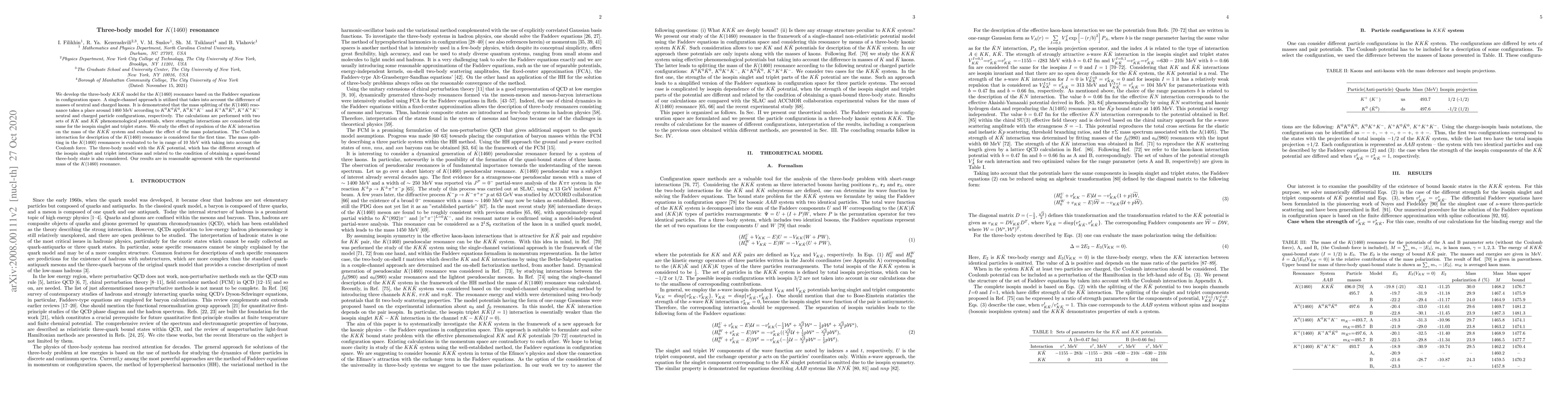 This paper develops a three-body $KK\bar K$ model for the $K(1460)$ resonance using Faddeev equations, showing mass splitting around 1460 MeV for different $K$ configurations. The study evaluates the effects of $KK$ repulsion and Coulomb interaction, finding a mass splitting of about 10 MeV due to the latter, and results are consistent with experimental data.
