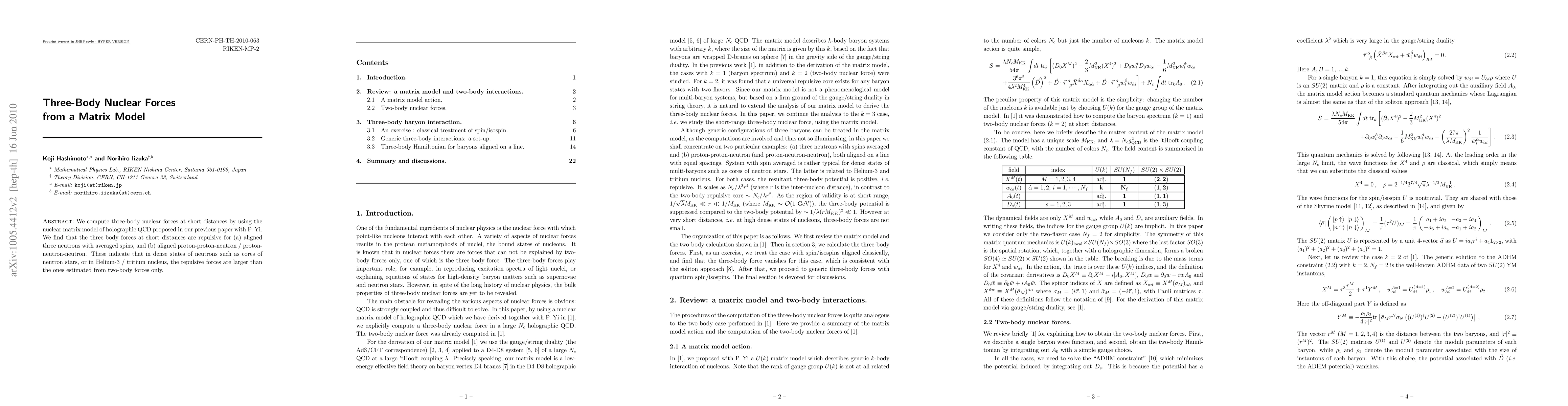 We compute three-body nuclear forces at short distances by using the nuclear matrix model of holographic QCD proposed in our previous paper with P. Yi. We find that the three-body forces at short distances are repulsive for (a) aligned three neutrons with averaged spins, and (b) aligned proton-proton-neutron / proton-neutron-neutron. These indicate that in dense states of neutrons such as cores of neutron stars, or in Helium-3 / tritium nucleus, the repulsive forces are larger than the ones estimated from two-body forces only.