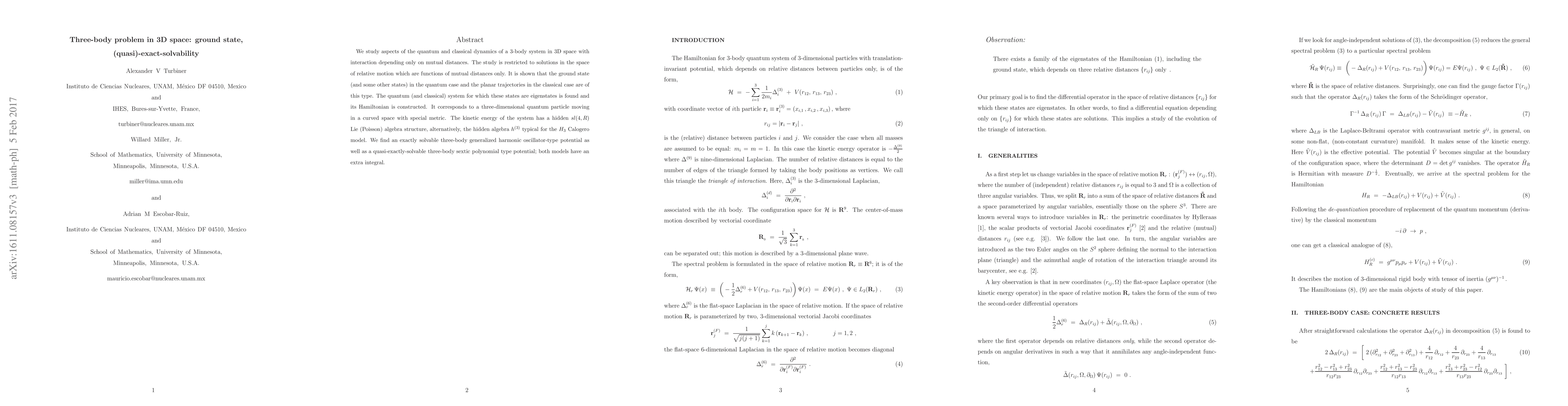 We study aspects of the quantum and classical dynamics of a $3$-body system in 3D space with interaction depending only on mutual distances. The study is restricted to solutions in the space of relative motion which are functions of mutual distances only. It is shown that the ground state (and some other states) in the quantum case and the planar trajectories in the classical case are of this type. The quantum (and classical) system for which these states are eigenstates is found and its Hamiltonian is constructed. It corresponds to a three-dimensional quantum particle moving in a curved space with special metric. The kinetic energy of the system has a hidden $sl(4,R)$ Lie (Poisson) algebra structure, alternatively, the hidden algebra $h^{(3)}$ typical for the $H_3$ Calogero model. We find an exactly solvable three-body generalized harmonic oscillator-type potential as well as a quasi-exactly-solvable three-body sextic polynomial type potential; both models have an extra integral.