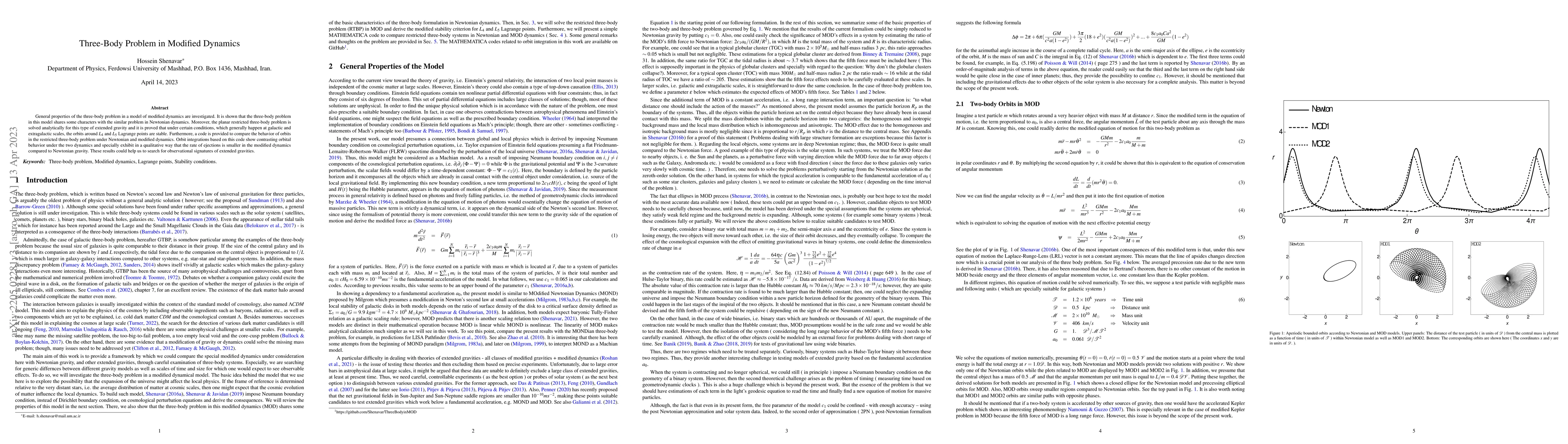 This paper investigates the three-body problem in modified dynamics, showing similarities to Newtonian dynamics and solving the planar restricted three-body problem analytically. It demonstrates that orbits around $L_{4}$ and $L_{5}$ are stable under certain conditions, and provides a code to compare orbital behavior, revealing a lower rate of ejections in modified dynamics compared to Newtonian gravity.