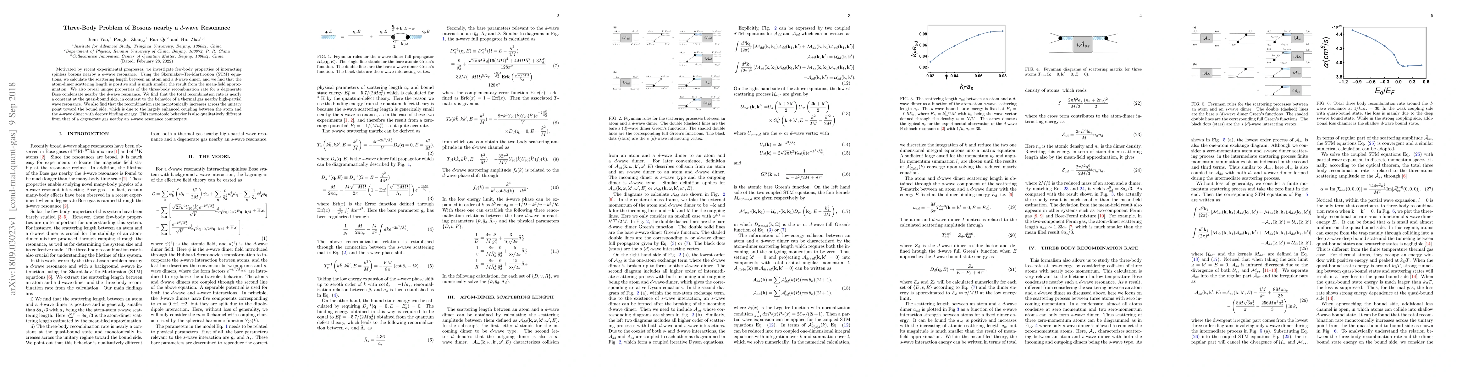 Motivated by recent experimental progresses, we investigate few-body properties of interacting spinless bosons nearby a d-wave resonance. Using the Skorniakov-Ter-Martirosion (STM) equations, we calculate the scattering length between an atom and a d-wave dimer, and we find that the atom-dimer scattering length is positive and is much smaller the result from the mean-field approximation. We also reveal unique properties of the three-body recombination rate for a degenerate Bose condensate nearby the d-wave resonance. We find that the total recombination rate is nearly a constant at the quasi-bound side, in contrast to the behavior of a thermal gas nearby high-partial wave resonance. We also find that the recombination rate monotonically increases across the unitary point toward the bound side, which is due to the largely enhanced coupling between the atom and the d-wave dimer with deeper binding energy. This monotonic behavior is also qualitatively different from that of a degenerate gas nearby an s-wave resonance counterpart.