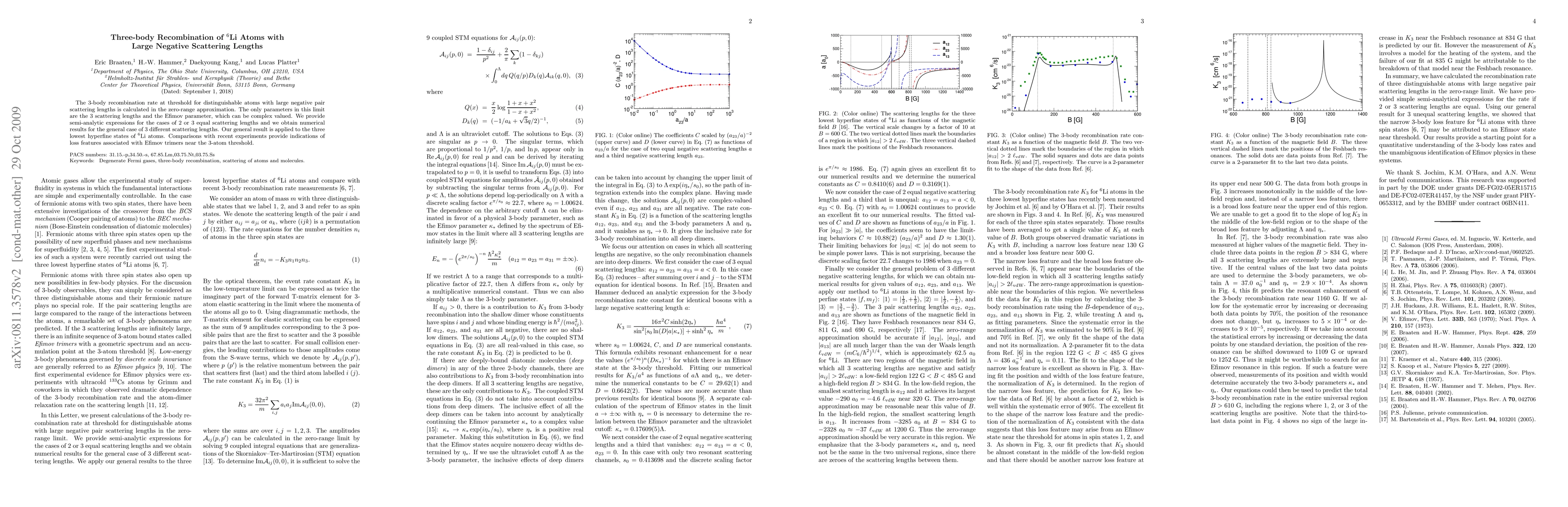Researchers calculated the recombination rate of Lithium-6 atoms with large negative pair scattering lengths using a zero-range approximation, finding loss features associated with Efimov trimers near threshold.