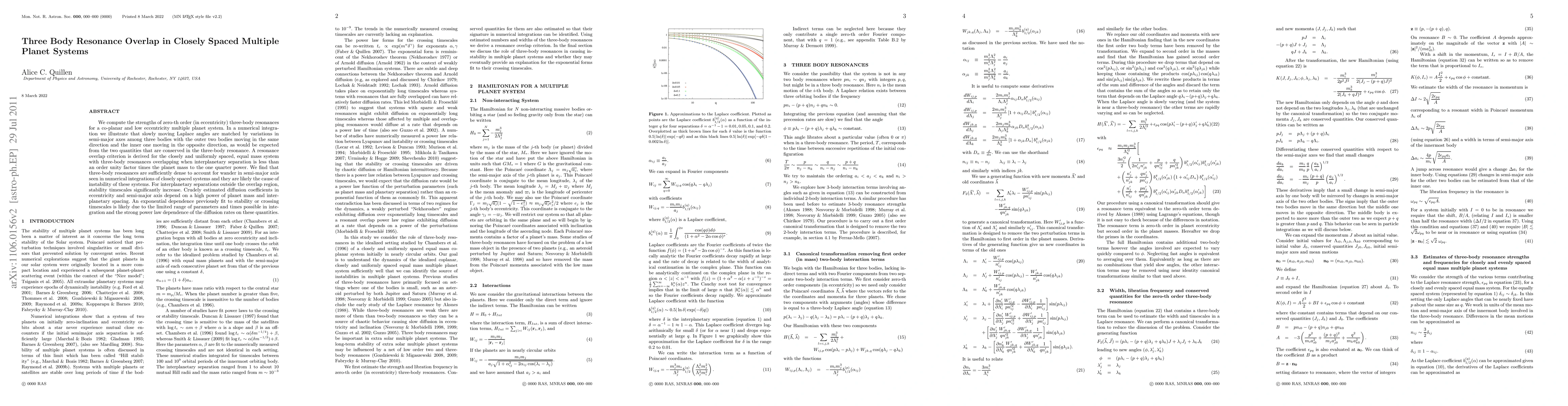 This paper investigates three-body resonance overlap in closely spaced, low-eccentricity multi-planet systems, finding that resonance overlap leads to instability and significant semi-major axis wander. The study derives a criterion for resonance overlap, showing that it occurs when separations are less than an order unity factor times the planet mass to the one-quarter power.