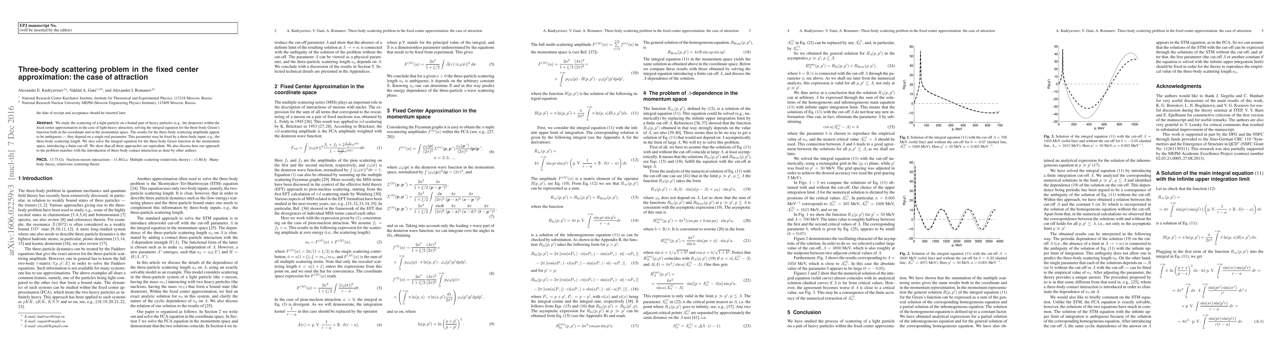 We study the scattering of a light particle on a bound pair of heavy particles (e.g., the deuteron) within the fixed center approximation in the case of light-heavy attraction, solving the integral equation for the three-body Green's function both in the coordinate and in the momentum space. The results for the three-body scattering amplitude appear to be ambiguous -- they depend on a single real parameter. This parameter may be fixed by a three-body input, e.g., the three-body scattering length. We also solve the integral equation for the three-body Green function in the momentum space, introducing a finite cut-off. We show that all three approaches are equivalent. We also discuss how our approach to the problem matches with the introduction of three-body contact interaction as done by other authors.