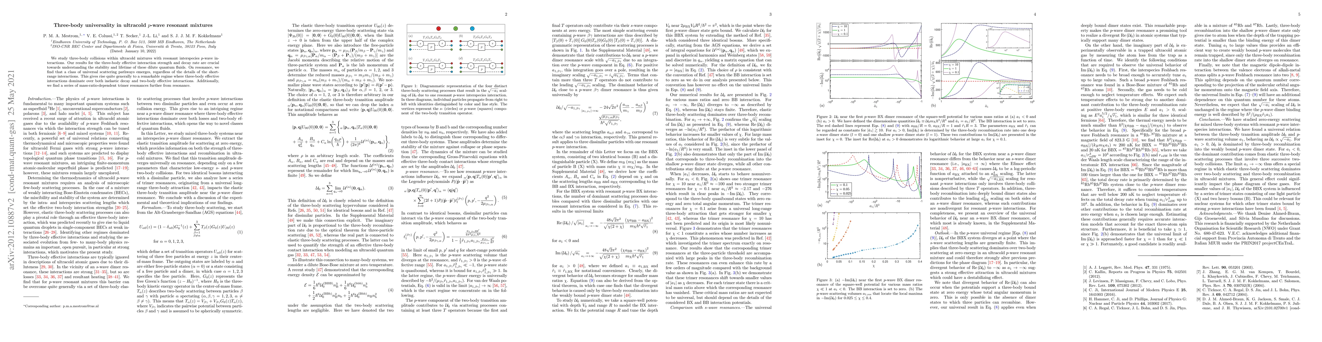 This paper investigates three-body collisions in ultracold mixtures with resonant $p$-wave interactions, revealing universal scattering pathways and a regime where three-body interactions dominate over decay and two-body effects. The findings provide insights into the stability and lifetime of these quantum fluids.