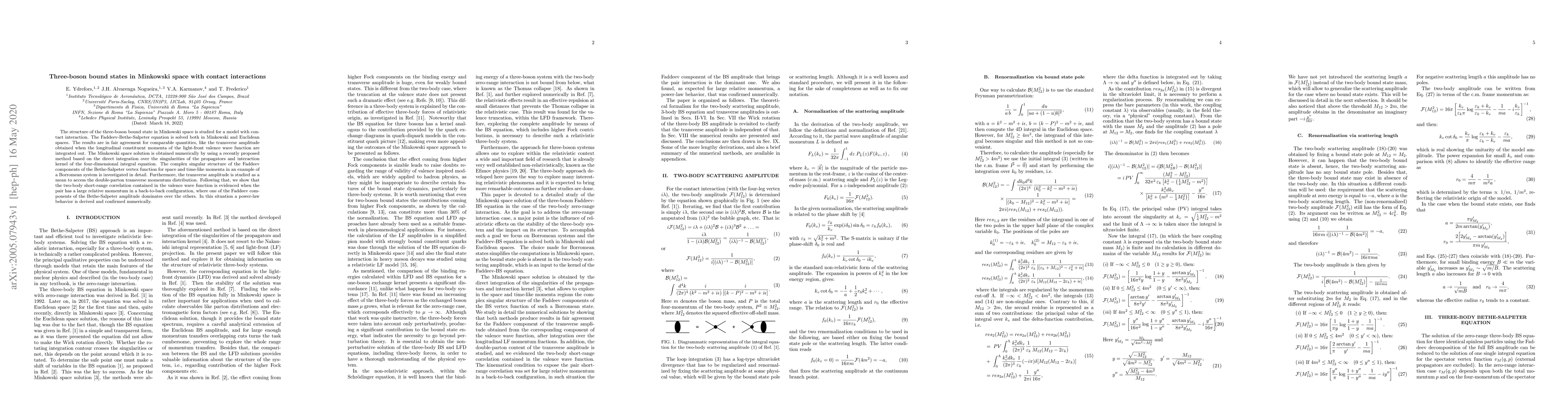 The structure of the three-boson bound state in Minkowski space is studied for a model with contact interaction. The Faddeev-Bethe-Salpeter equation is solved both in Minkowski and Euclidean spaces. The results are in fair agreement for comparable quantities, like the transverse amplitude obtained when the longitudinal constituent momenta of the light-front valence wave function are integrated out. The Minkowski space solution is obtained numerically by using a recently proposed method based on the direct integration over the singularities of the propagators and interaction kernel of the four-dimensional integral equation. The complex singular structure of the Faddeev components of the Bethe-Salpeter vertex function for space and time-like momenta in an example of a Borromean system is investigated in detail. Furthermore, the transverse amplitude is studied as a mean to access the double-parton transverse momentum distribution. Following that, we show that the two-body short-range correlation contained in the valence wave function is evidenced when the pair has a large relative momentum in a back-to-back configuration, where one of the Faddeev components of the Bethe-Salpeter amplitude dominates over the others. In this situation a power-law behavior is derived and confirmed numerically.