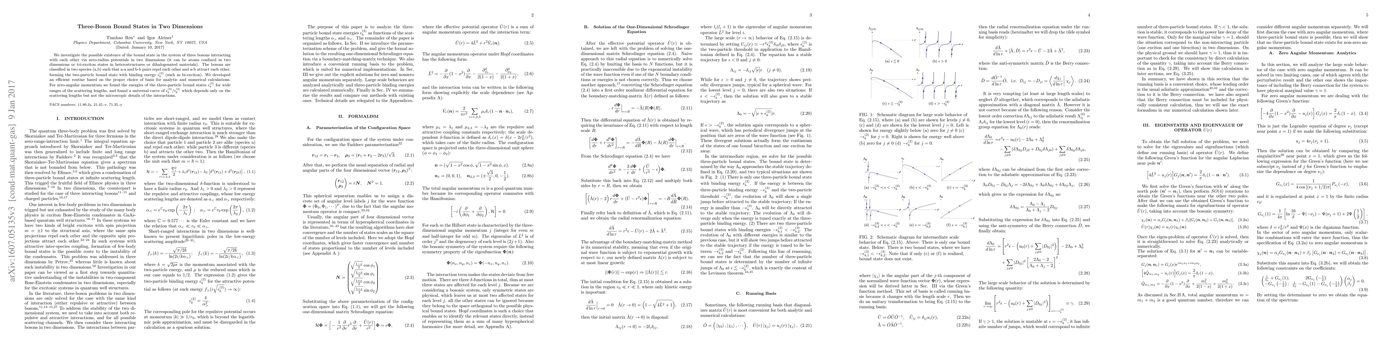 We investigate the possible existence of the bound state in the system of three bosons interacting with each other via zero-radius potentials in two dimensions (it can be atoms confined in two dimensions or tri-exciton states in heterostructures or dihalogenated materials). The bosons are classified in two species (a,b) such that a-a and b-b pairs repel each other and a-b attract each other, forming the two-particle bound state with binding energy $\epsilon_b^{(2)}$ (such as bi-exciton). We developed an efficient routine based on the proper choice of basis for analytic and numerical calculations. For zero-angular momentum we found the energies of the three-particle bound states $\epsilon^{(3)}_b$ for wide ranges of the scattering lengths, and found a universal curve of $\epsilon^{(3)}_b/\epsilon^{(2)}_b$ which depends only on the scattering lengths but not the microscopic details of the interactions, this is in contrast to the three-dimensional Efimov effect, where a non-universal three-body parameter is needed.