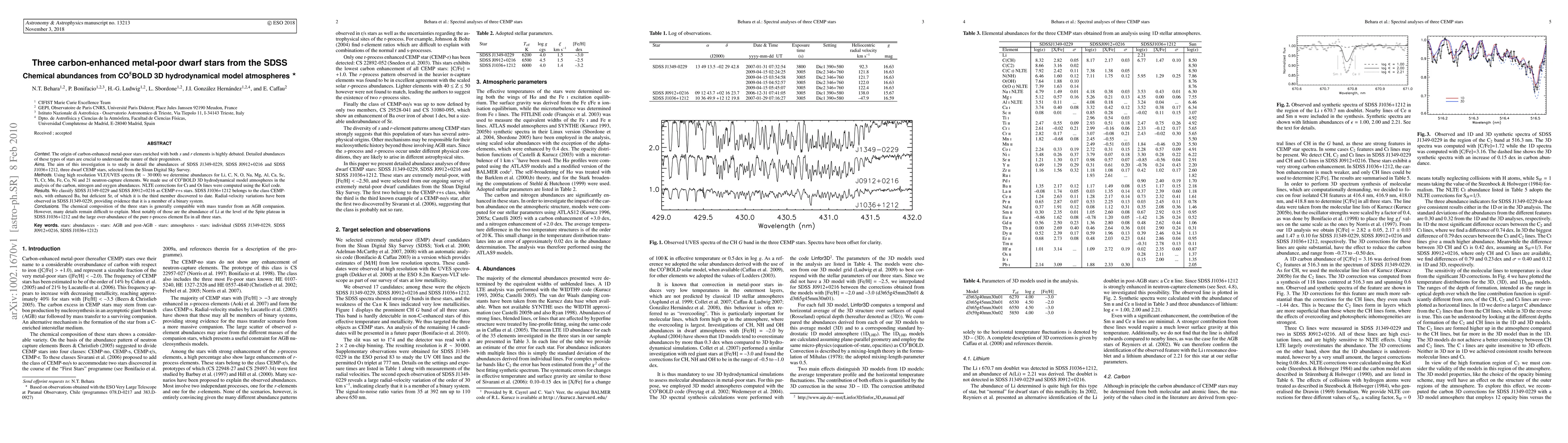 Researchers analyzed three carbon-enhanced metal-poor stars for their chemical composition, finding compatibility with mass transfer from an AGB companion, but unclear details such as lithium abundance and the Eu element.