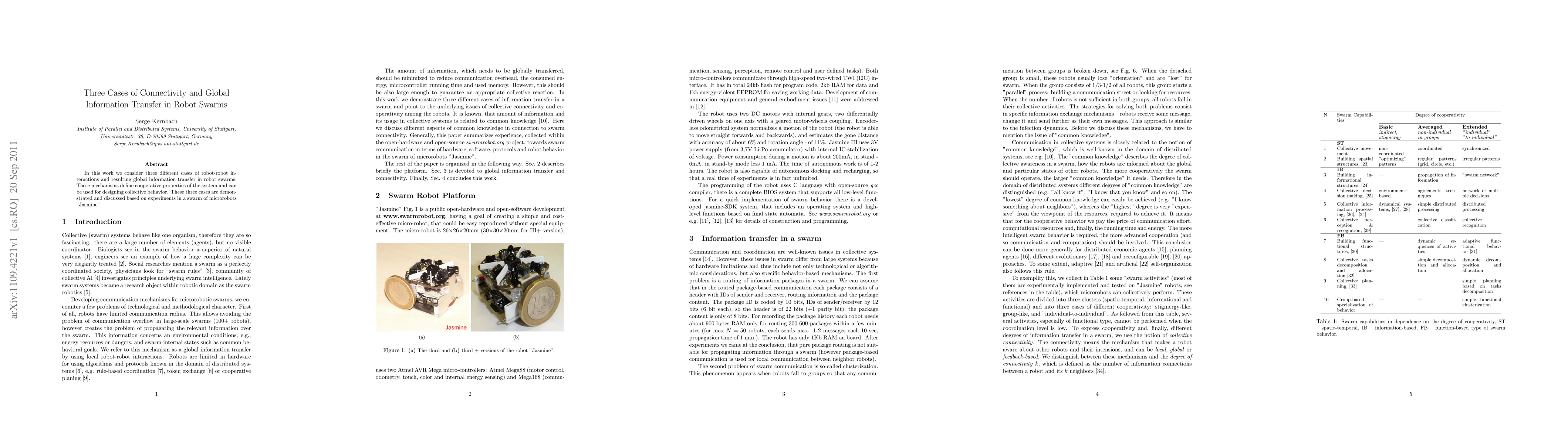 This paper investigates three distinct interaction mechanisms in robot swarms that facilitate global information transfer, showcasing their cooperative properties through experiments with the microrobot swarm "Jasmine" and informing the design of collective behavior.