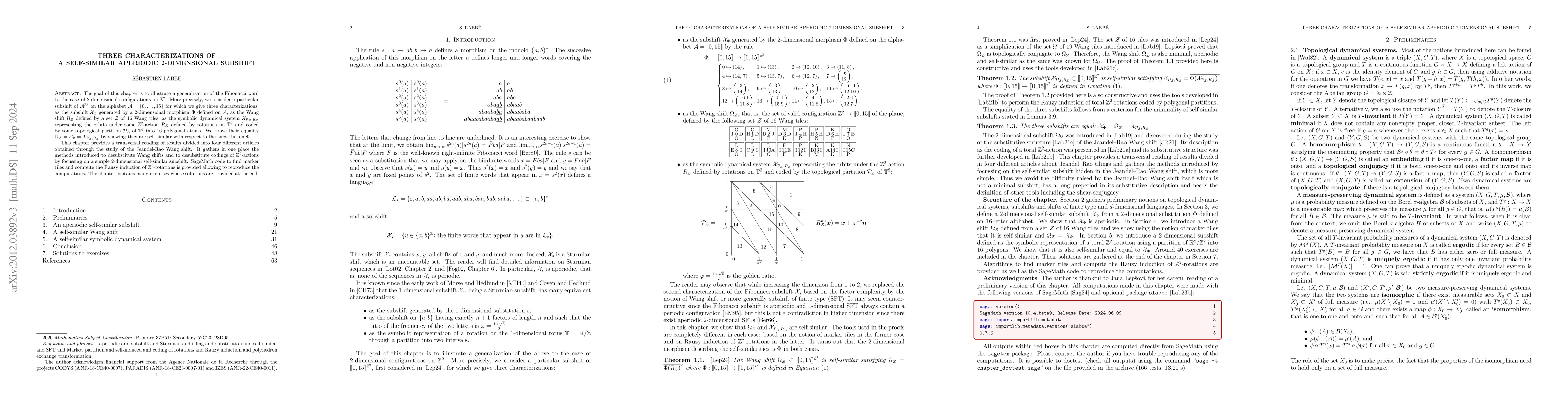 The goal of this chapter is to illustrate a generalization of the Fibonacci word to the case of 2-dimensional configurations on $\mathbb{Z}^2$. More precisely, we consider a particular subshift of $\mathcal{A}^{\mathbb{Z}^2}$ on the alphabet $\mathcal{A}=\{0,\dots,18\}$ for which we give three characterizations: as the subshift $\mathcal{X}_\phi$ generated by a 2-dimensional morphism $\phi$ defined on $\mathcal{A}$; as the Wang shift $\Omega_\mathcal{U}$ defined by a set $\mathcal{U}$ of 19 Wang tiles; as the symbolic dynamical system $\mathcal{X}_{\mathcal{P}_\mathcal{U},R_\mathcal{U}}$ representing the orbits under some $\mathbb{Z}^2$-action $R_\mathcal{U}$ defined by rotations on $\mathbb{T}^2$ and coded by some topological partition $\mathcal{P}_\mathcal{U}$ of $\mathbb{T}^2$ into 19 polygonal atoms. We prove their equality $\Omega_\mathcal{U} =\mathcal{X}_\phi=\mathcal{X}_{\mathcal{P}_\mathcal{U},R_\mathcal{U}}$ by showing they are self-similar with respect to the substitution $\phi$. This chapter provides a transversal reading of results divided into four different articles obtained through the study of the Jeandel-Rao Wang shift. It gathers in one place the methods introduced to desubstitute Wang shifts and to desubstitute codings of $\mathbb{Z}^2$-actions by focussing on a simple 2-dimensional self-similar subshift. SageMath code to find marker tiles and compute the Rauzy induction of $\mathbb{Z}^2$-rotations is provided allowing to reproduce the computations.