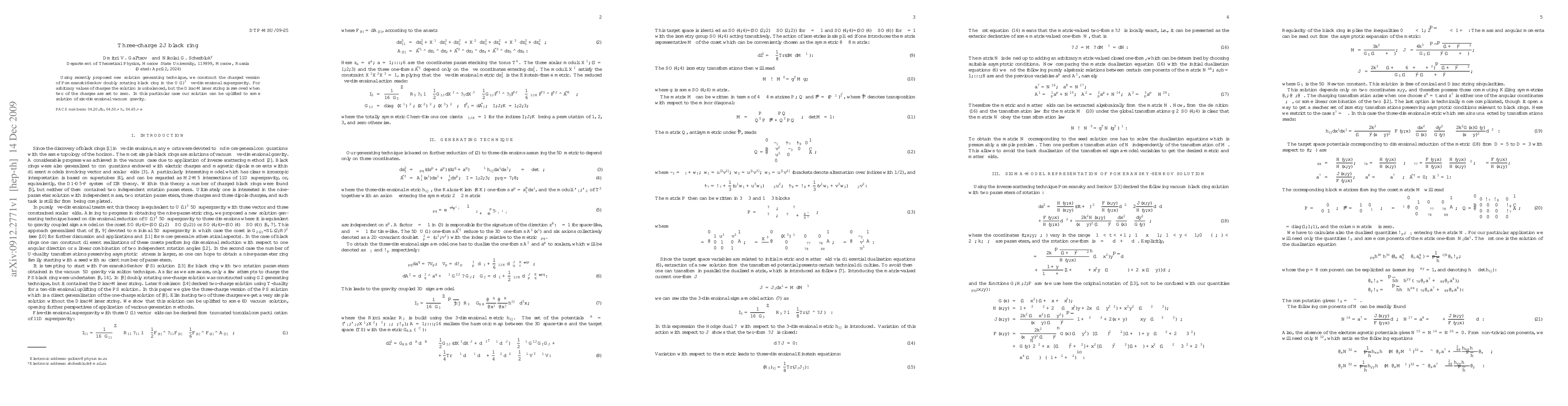 Using recently proposed new solution generating technique, we construct the charged version of Pomeranski-Senkov doubly rotating black ring in the $U(1)^3$ five-dimensional supergravity. For arbitrary values of charges the solution is unbalanced, but the Dirac-Misner string is removed when two of the charges are set to zero. In this particular case our solution can be uplifted to some solution of six-dimensional vacuum gravity.
