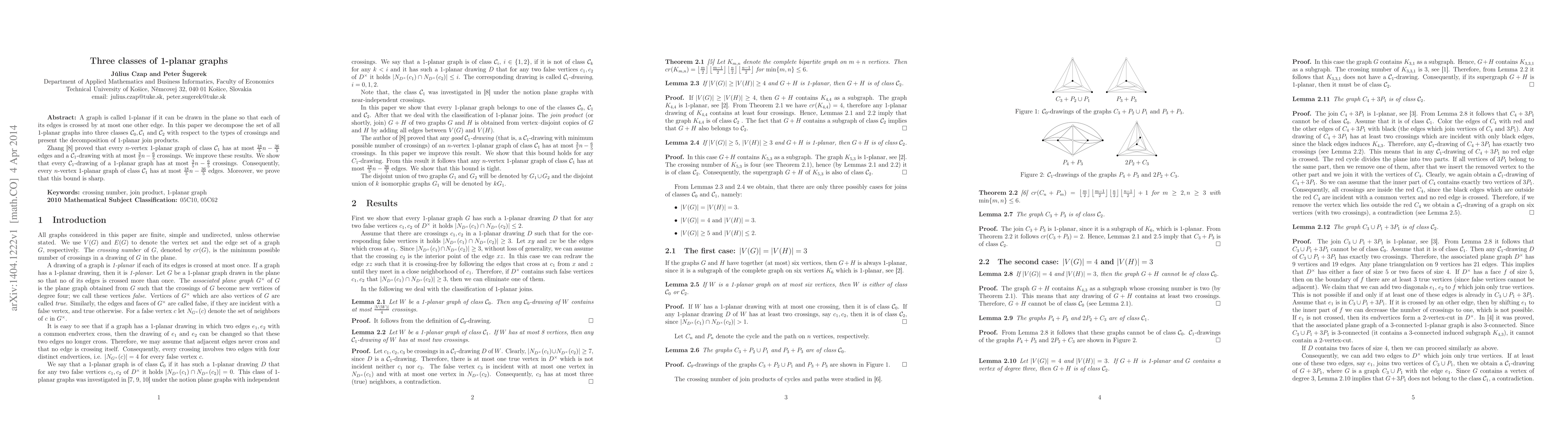 This paper categorizes 1-planar graphs into three classes ($\mathcal C_0, \mathcal C_1$, and $\mathcal C_2$) based on crossing types and analyzes their join products. It improves the edge count and crossing results for class $\mathcal C_1$ graphs, proving a sharp bound of $\frac{18}{5}n-\frac{36}{5}$ edges and $\frac 35 n-\frac 65$ crossings.