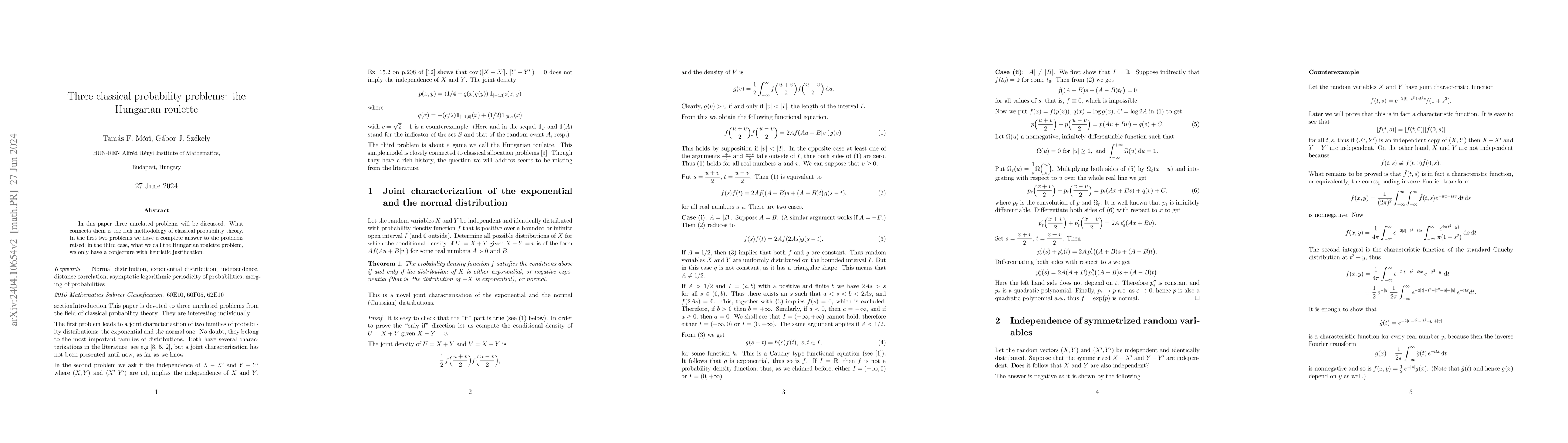 Title: Three classical probability problems: the Hungarian roulette Summary: This paper explores three distinct probability problems unified by classical probability theory methods; two have definitive solutions, while the third, termed the Hungarian roulette problem, remains conjectural with heuristic support.