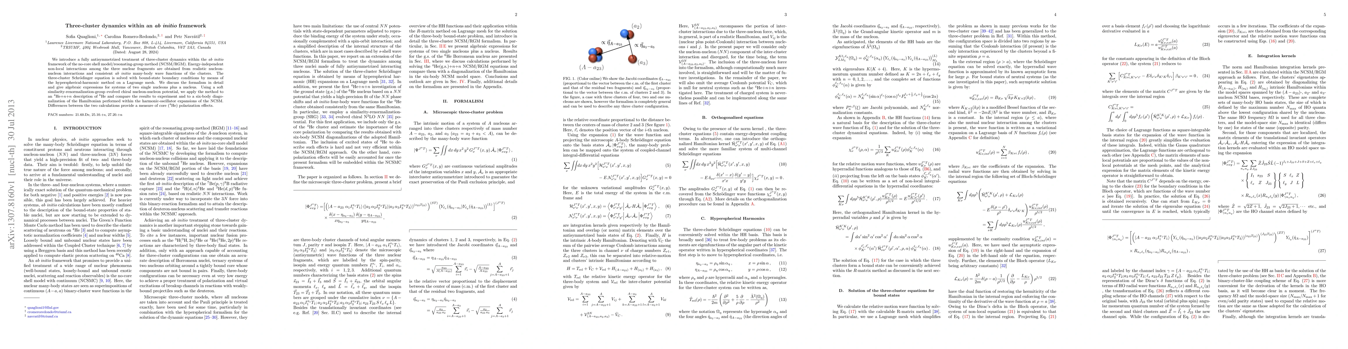 This paper presents an ab initio framework for three-cluster dynamics using the no-core shell model/resonating-group method, solving the three-cluster Schrödinger equation with energy-independent non-local interactions derived from realistic nucleon-nucleon potentials. The method is applied to $^6$He, revealing core polarization effects compared to six-body diagonalization.
