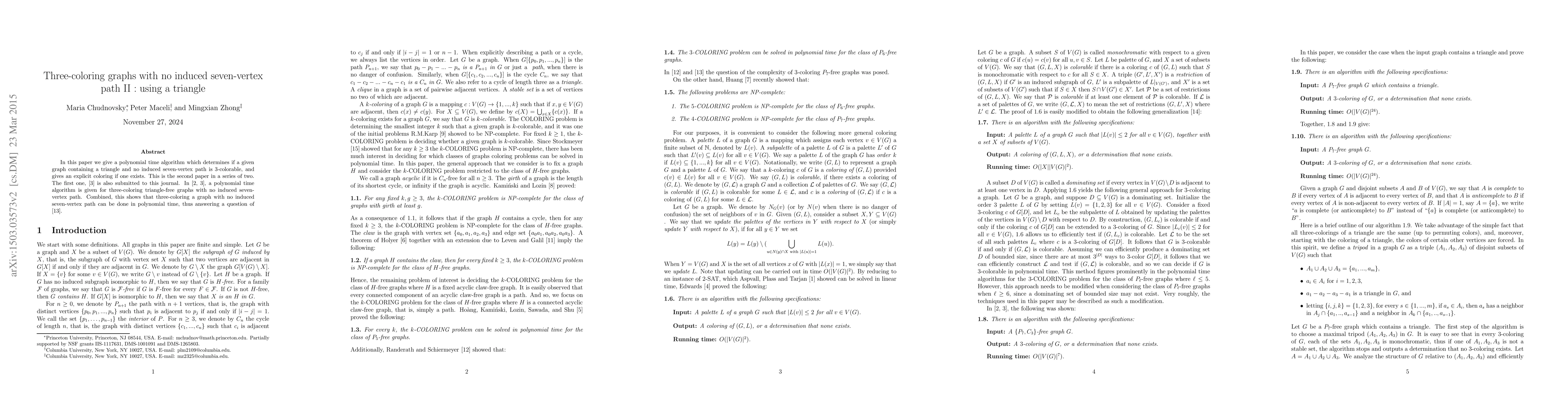 This paper presents a polynomial time algorithm for determining 3-colorability in graphs containing a triangle but no induced seven-vertex path, providing an explicit coloring when possible. This builds on previous work for triangle-free graphs, demonstrating the broader applicability of polynomial-time three-coloring algorithms for such graphs.