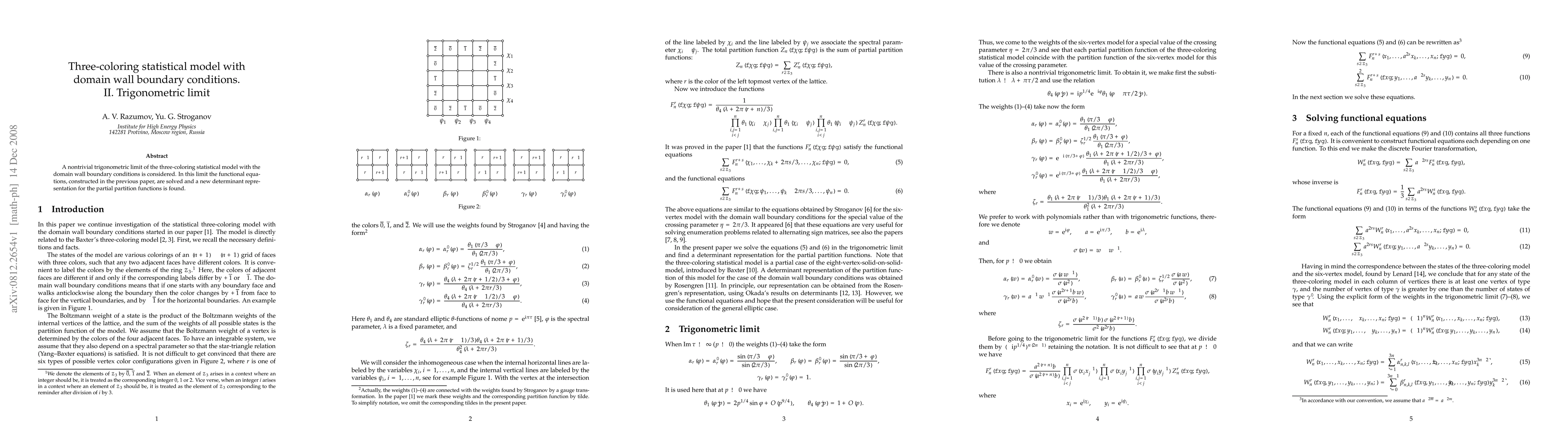 This paper explores a nontrivial trigonometric limit of a three-coloring statistical model with domain wall boundary conditions, solving the functional equations from a previous study and deriving a new determinant representation for the partial partition functions.